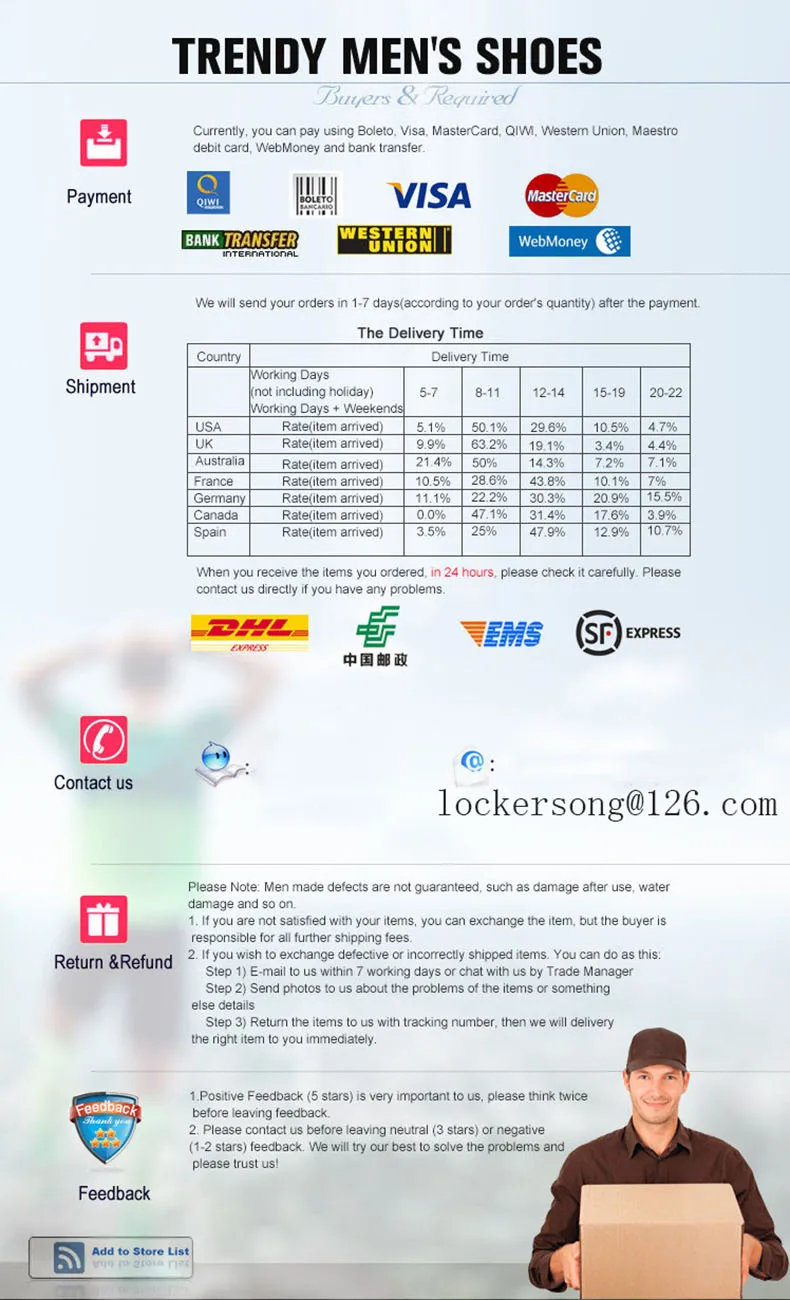 Примечание:1. Американский размер или европейский размер могут отличаться от вашей страны, пожалуйста, выберите размер только в соответствии с длиной Вашей стопы.2. Если ваша стопа толстая или широкая, мы предлагаем вам выбрать на один размер больше, если вы не уверены, пожалуйста, свяжитесь с нами.3. Чтобы быстрее пройти ваш местный заказ, мы упакуем обувь «без коробки», пожалуйста, поймите.4. Пожалуйста, проверьте правильность информации о вашем заказе, включая имя получателя, адрес доставки, телефон и почтовый индекс.5. Если возникнут какие-либо проблемы во время покупок, время доставки или после получения товара, пожалуйста, свяжитесь с нами.