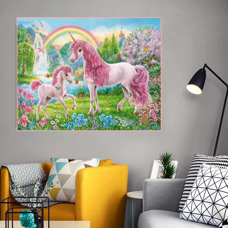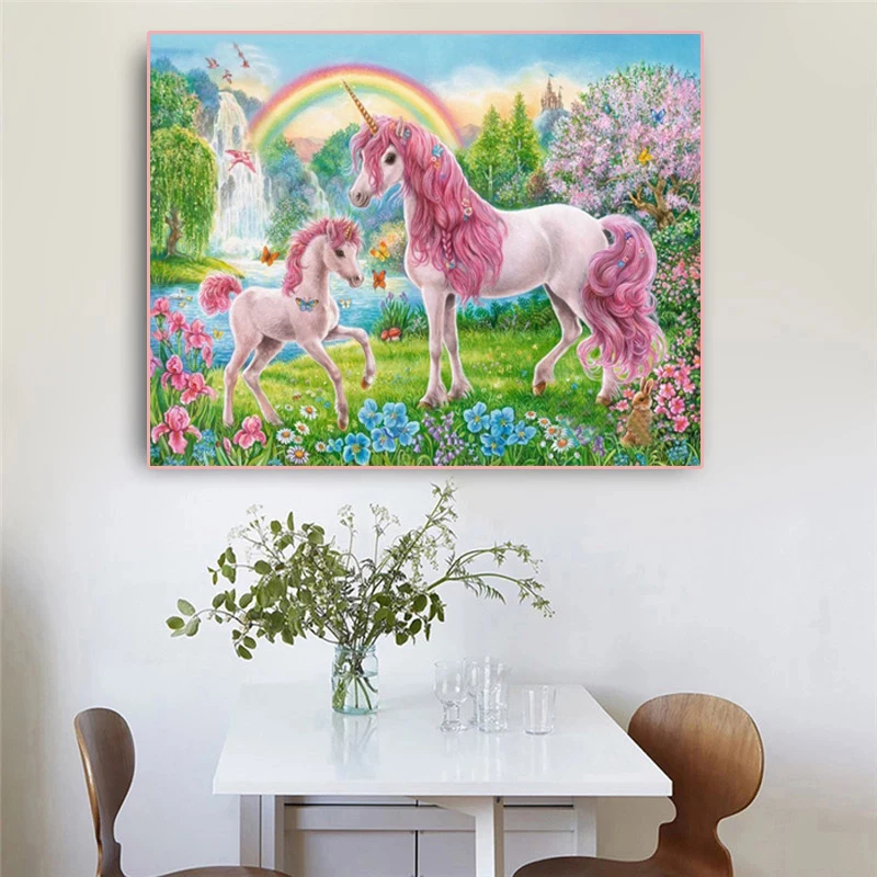 Цвет живопись животного Розовый Единорог живопись на холсте с изображением лошади печати плакатов и принтами для всей семьи детская спальня украшения
