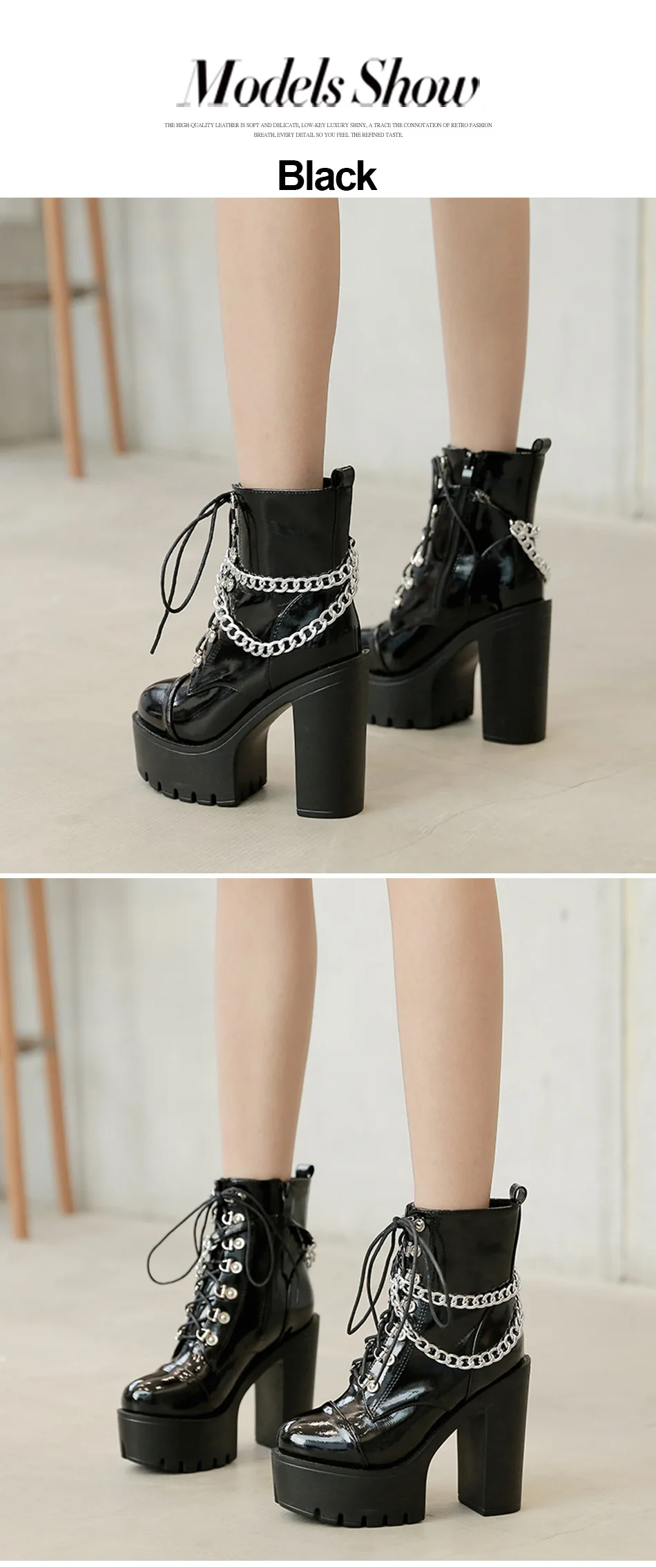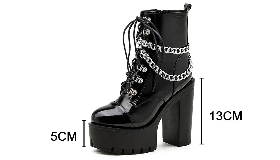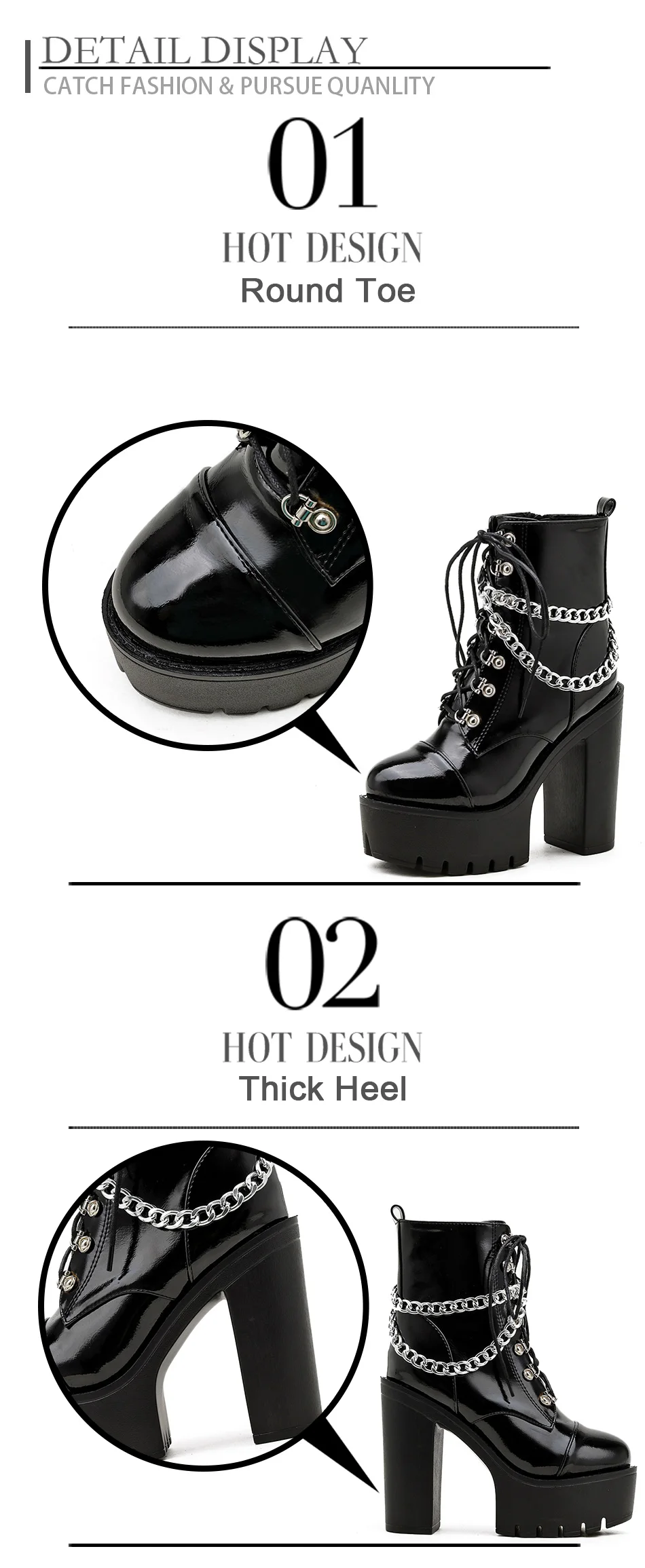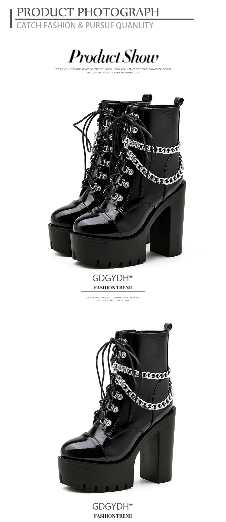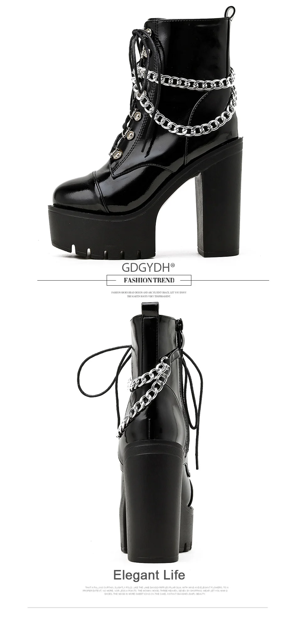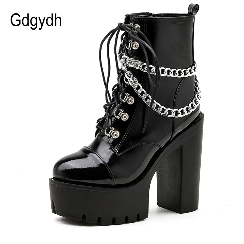 Женские ботильоны в готическом стиле Gdgydh, черные ботильоны из лакированной кожи на высоком каблуке, на молнии, с цепочкой, в стиле панк, на осень