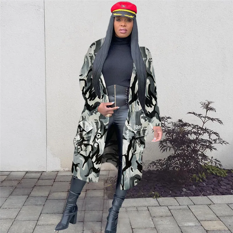 Камуфляжный плащ-Тренч куртки для женщин 2020 размера плюс одежда с принтом в виде надписи, пальто уличная длинная Стиль укороченный топ; Оптовая продажа; Прямая поставка;