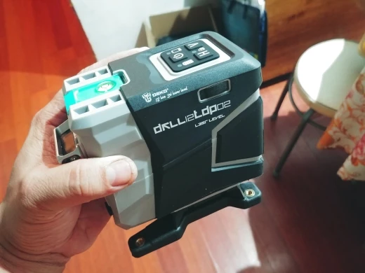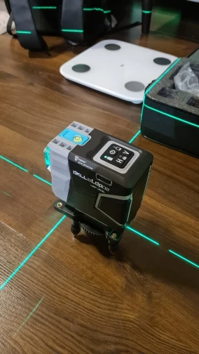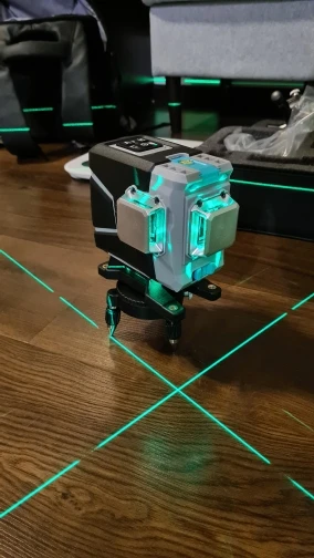 качество сборки отличное. луч яркий, видно даже рядом с источниками света. толщина линий около 1 мм на удалении около 4 метров. ожидал что будет точнее. на 6.5 метрах отклонение линии горизонта около 2 мм. чехол слишком громоздкий даже для полного комплекта аксессуаров.