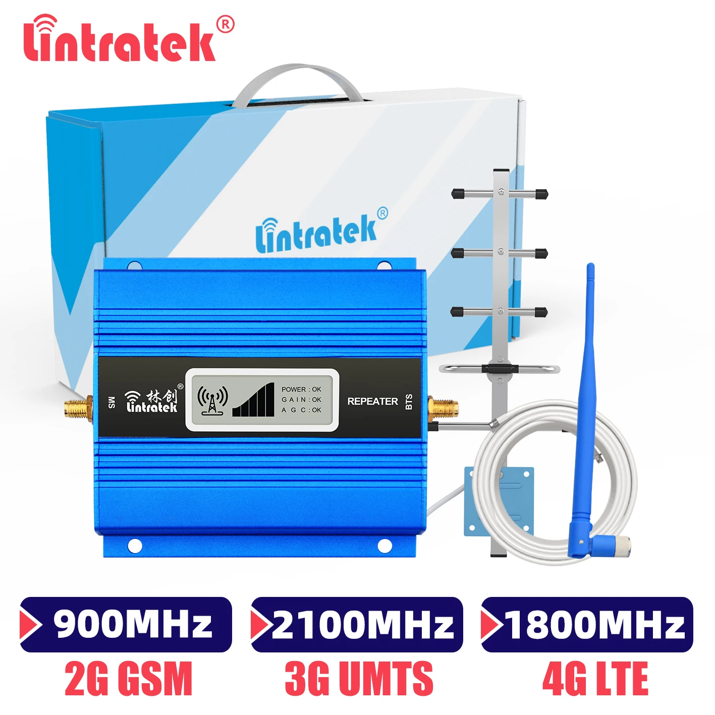 Lintratek Upgrade 2G 3G 4G ретранслятор сигнала 900 2100 1800 GSM UMTS интернет-усилитель с антенной 13db Yagi + кабель 10M + 5db Whip антенна