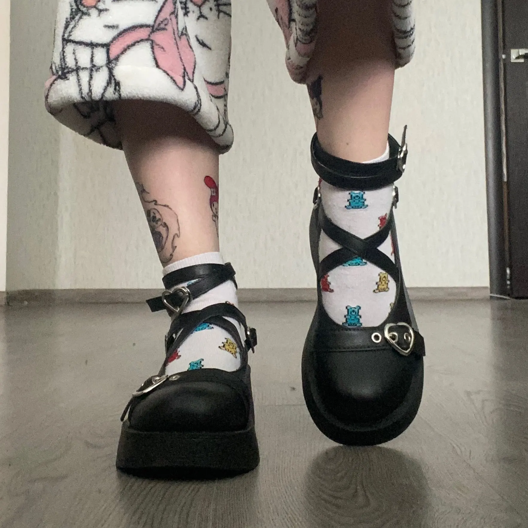Туфли женские, на платформе, с круглым носком, на толстом каблуке, с перекрестными шнурками, обувь Kawaii