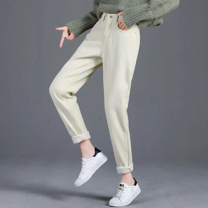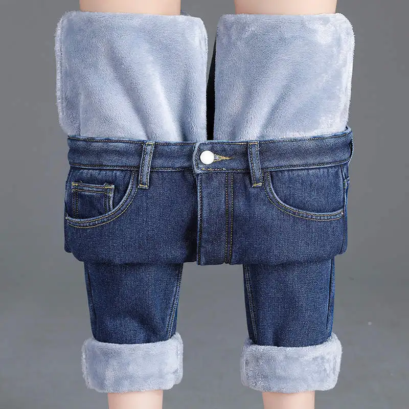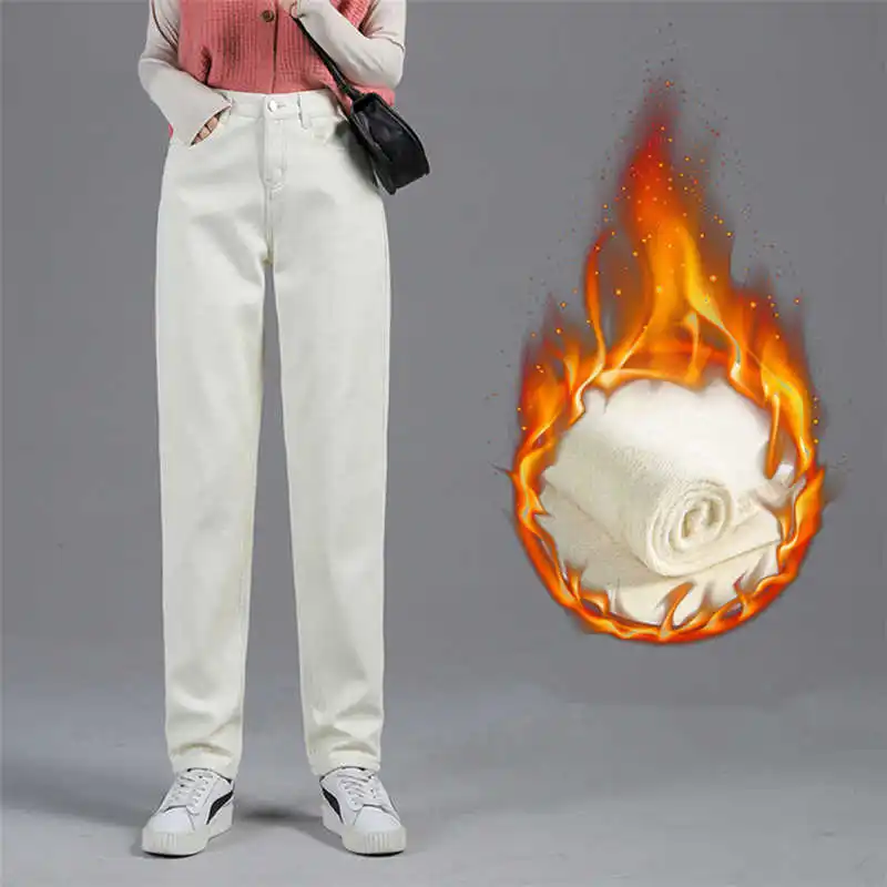 Женские утепленные джинсы-шаровары на флисе, прямые брюки с высокой талией, повседневные свободные теплые джинсы из денима, C6863, для осени и зимы