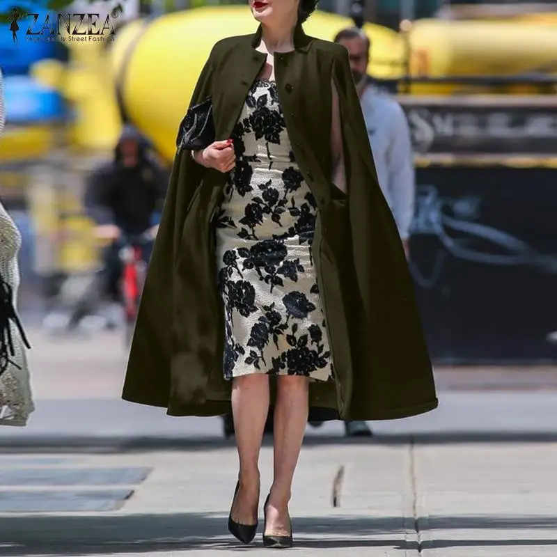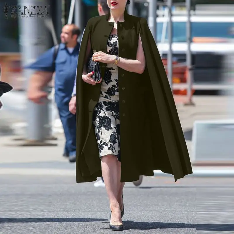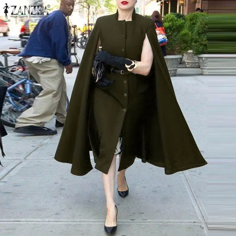 ZANZEA для женщин осень Стенд воротник, плотная ткань, длинные пальто накидки пончо модные повседневные офисные на пуговицах, верхняя одежда на пуху, пальто