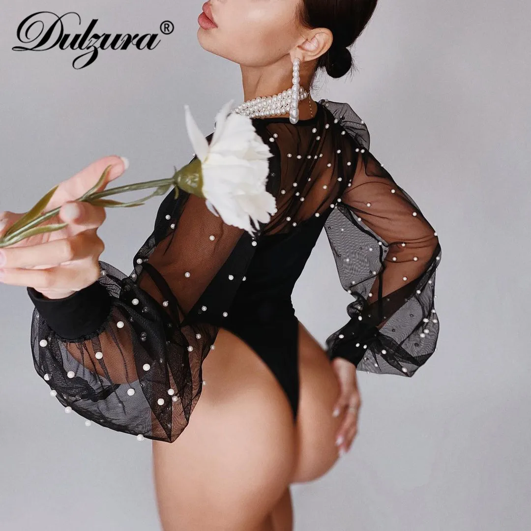 Женское боди с жемчужными вставками kayojuta, сетчатый трико с длин...