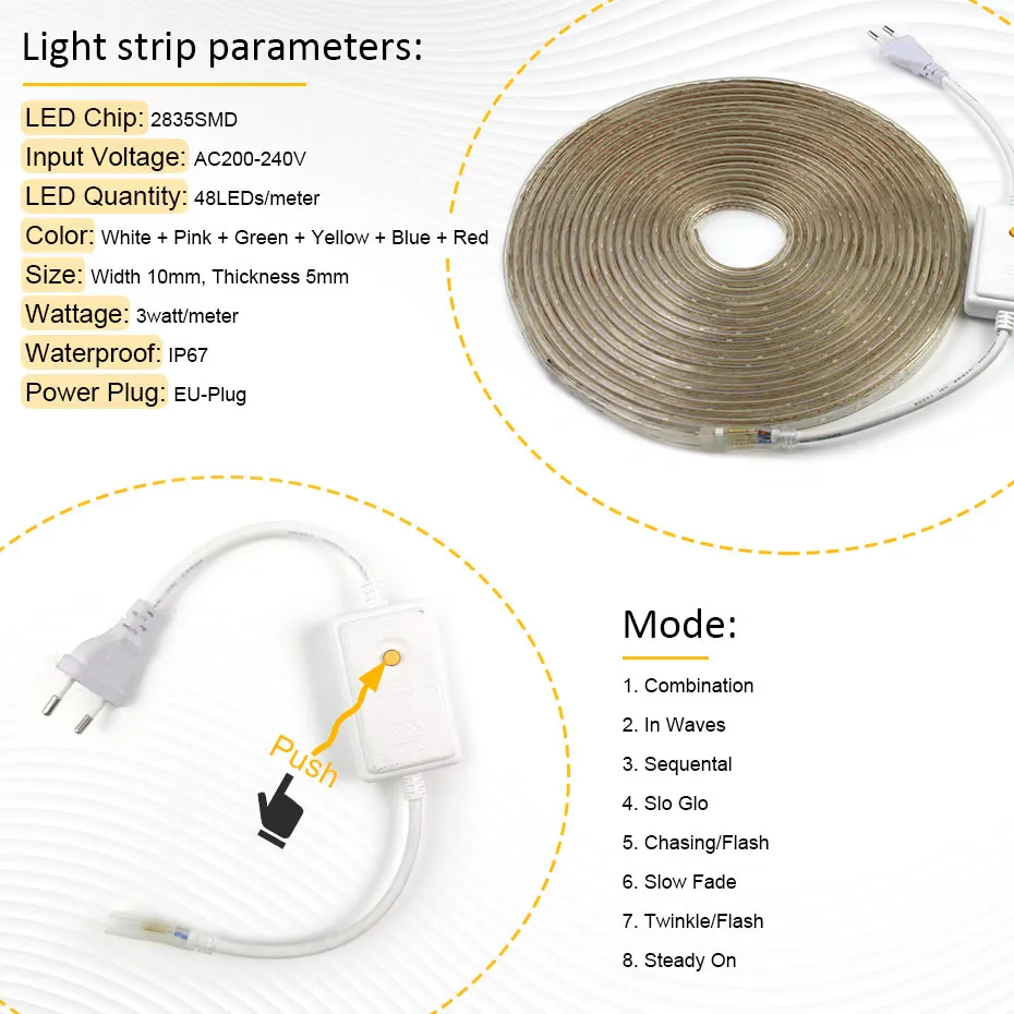 Водонепроницаемая светодиодная лента 220 В 2835 с вилкой европейского стандарта, уличный декор, светильник ная Диодная лента, RGB Светодиодная лента для сада