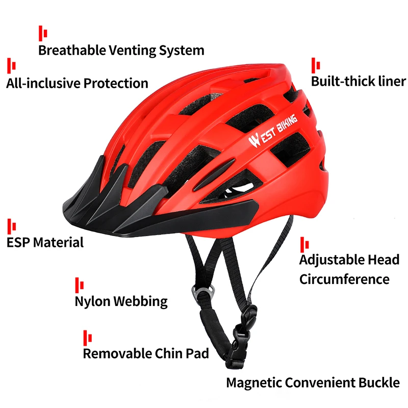 Материал: EPS + PC Вес нетто: около 433 г Окружность головы: 56-61 см Особенности: дышащие вентиляционные отверстия, внутренняя подкладка, солнцезащитный козырек, регулируемый ремешок Применение: катание на горных велосипедах, скутеры, велосипедные тропы, езда Цвета: черный/красный/белый