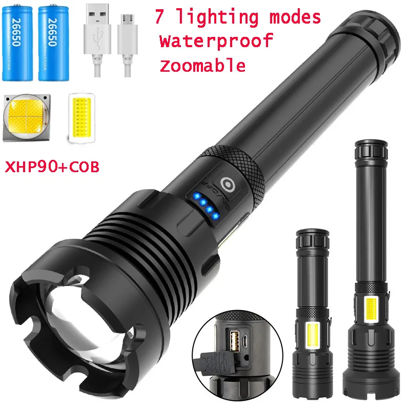 Мощный светодиодный фонарик с лампой XHP 90, 7 режимов освещения, монолитный блок светодиодов, масштабируемый фонарь с поддержкой микро-зарядки, Охотничья лампа