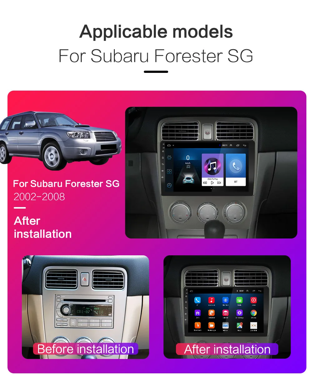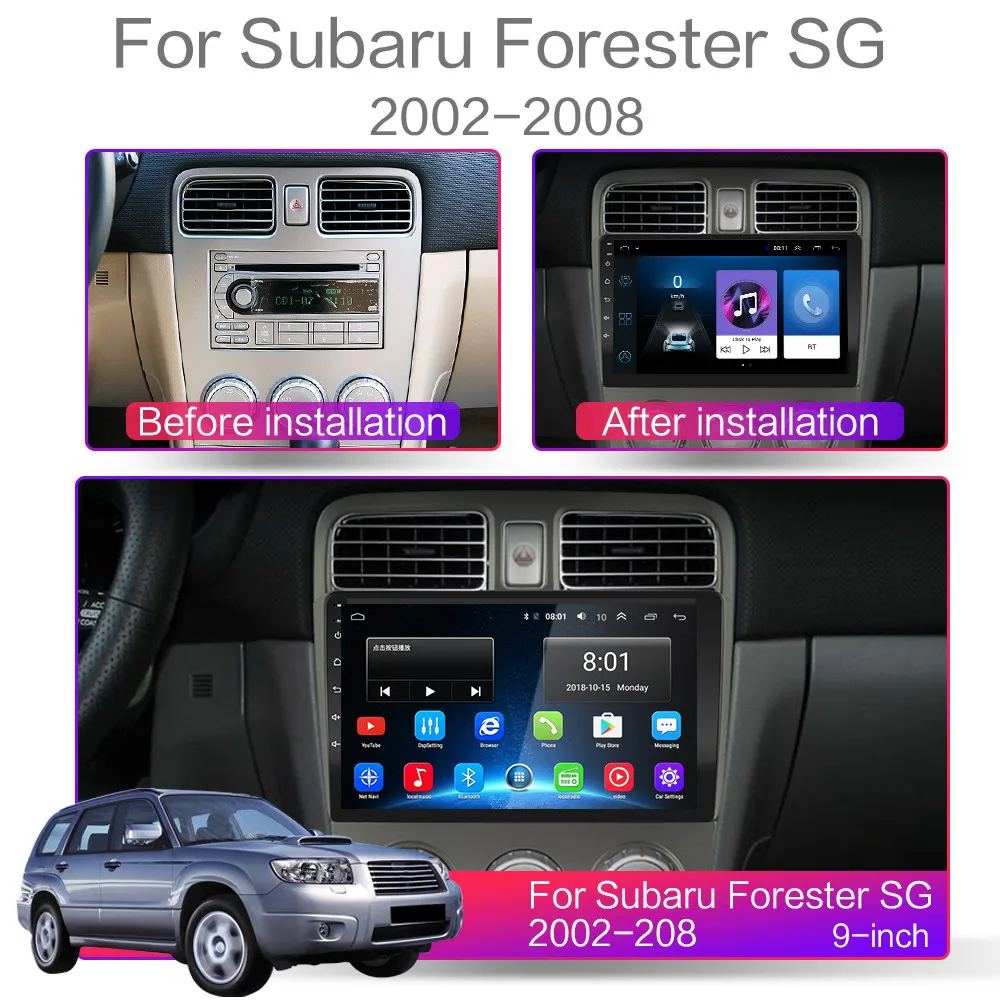 Для Subaru Forester SG 2002 2003 2004 2005 2006 2007 20081. Операционная система Android может установить приложение Google Play store Skype Facebook youTube Twitter и т. Д.2, 4-х ядерный конфигурация включает в себя (Оперативная память + Встроенная память): 1 Гб + 16 ГБ/2 ГБ + 16 ГБ/2G + 32G [дополнительно]3, 8-ядерный конфигурация включает в себя (Оперативная память + Встроенная память): 7216-1 г + 32 г/7216-2 г + 32 г/7216-4 г + 64 г/7216-6 г + 128 г/7216-8 г + 128 г/4G-SIM-5716-2G + 32G/4G-SIM-5716-4G + 64G/4G-SIM-5716-6G + 128G/4G-SIM-5716-8G + 128G [опционально]4, 4-ядерный содержит: версия: Android 9,0Разрешение: HD TM; 1024*600; Не поддерживает функцию AM и RDS;5, 8-ядерный содержит: версия: Android 10;Разрешение: HD IPS,7216-WIFI версия: поддержка s DSP, FM, RDS ,16EQ, HIFI, поддержка функции внешней carplay, сплит-экран, двойная запись спереди и сзади и 360 панорамных функций камеры; не поддерживает видеовыход;4G-SIM-5716-WIFI версия: 8-ядерный, Поддержка s DSP, FM, RDS, Hi-Fi, Разделение экран, Поддержка к внешним carplay функция, спереди и сзади двойная запись и 360 панорамная камера функций; не поддерживает видеовыход;6. Поддержка: радиостанция, Bluetooth Вызов, Bluetooth музыка, управление рулевым колесом, встроенный WiFi, MP3, видео музыка (MPG, AVI), навигация, видеовыход, зеркальная связь, USB 4G LTE WIFI ключ и другие функции; Поддержка выбора логотипа автомобиля; Sfactory пароль: 8888