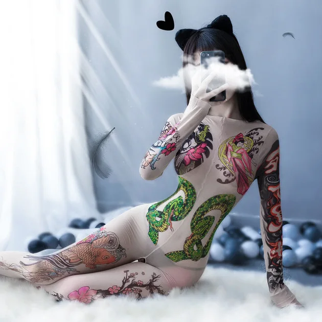 Женские колготки на все тело, длинные чулки с татуировкой, сексуальное эротическое нижнее белье, фетиш, Кружевное боди, нижнее белье
