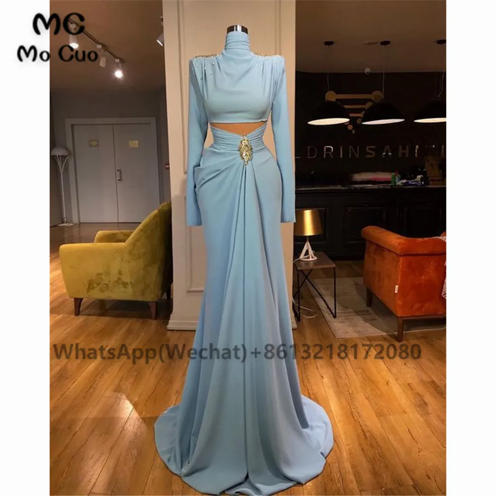 Русалка 2021 Длинные рукава Выпускные вечерние платья Длинные с высоким воротом плиссированные рюшами шифоновые женские вечерние платья на заказТкань