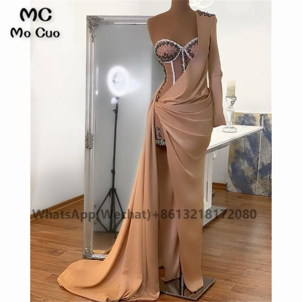 Оболочка 2021 одно плечо Выпускные вечерние платья бисером Милая Ruched атласная развертка поезд женское вечернее платье на заказТкань