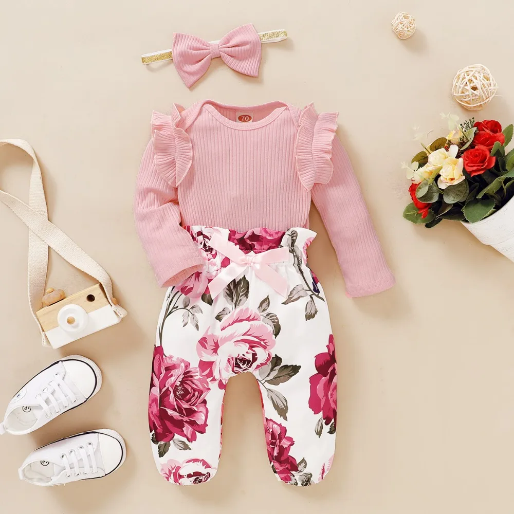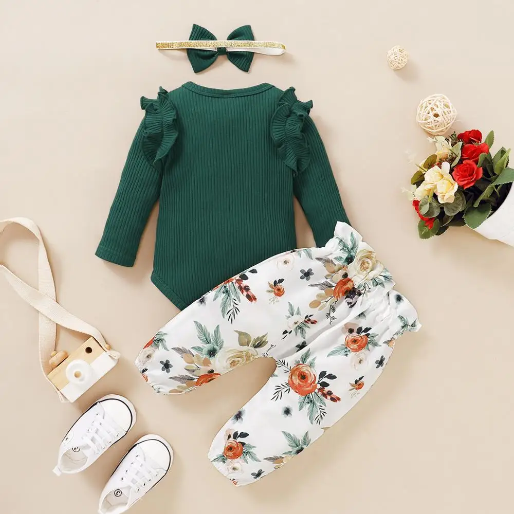 Милая Одежда для новорожденных девочек 0-24 месяцев комплект из 3 предметов, комбинезон с оборками на весну и осень для малышей штаны с бантом и повязкой на голову