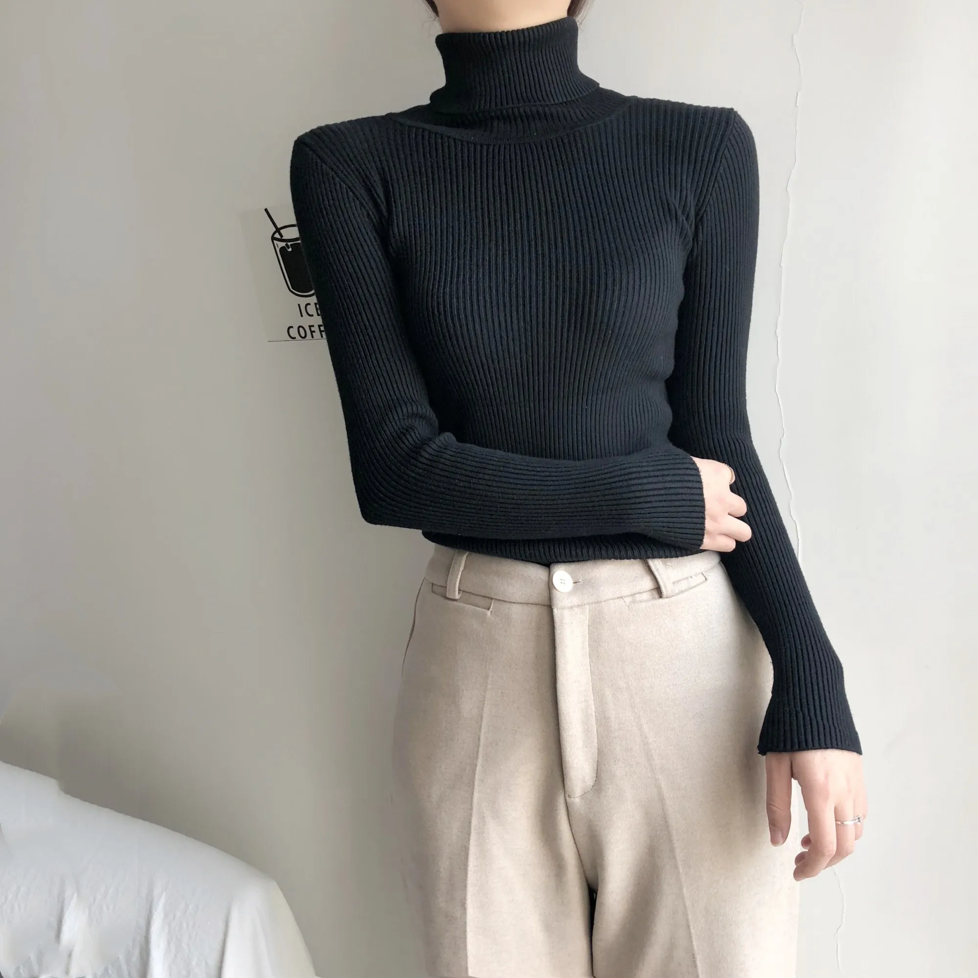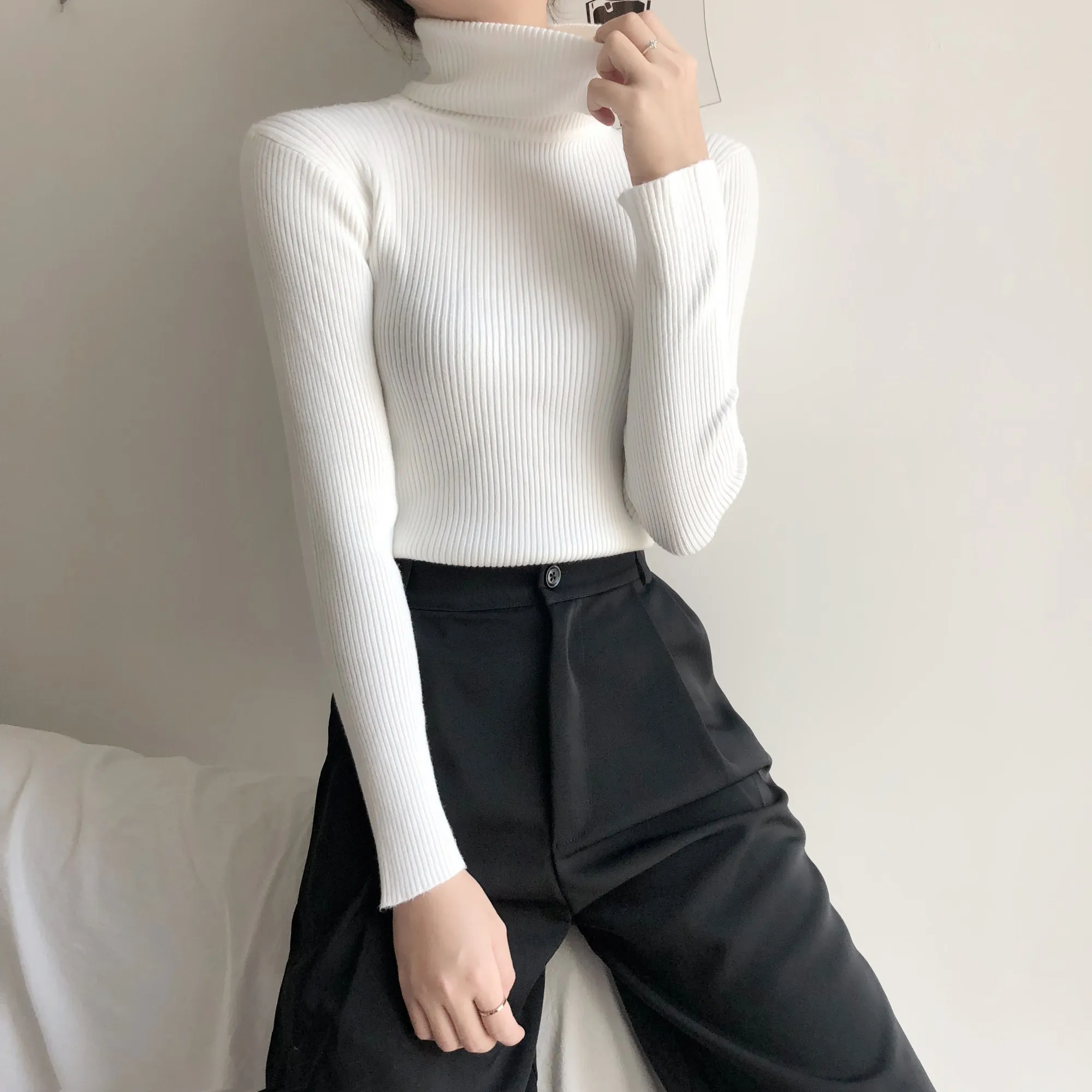 Женский трикотажный свитер в рубчик, плотный пуловер с длинным рукавом и высоким воротником, мягкий теплый облегающий джемпер, Осень-зима 2020