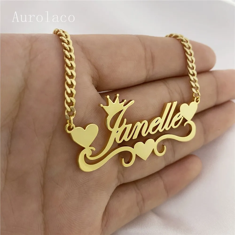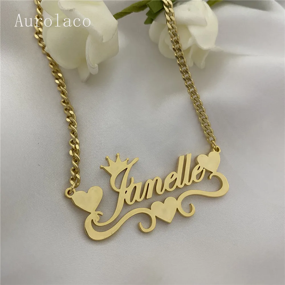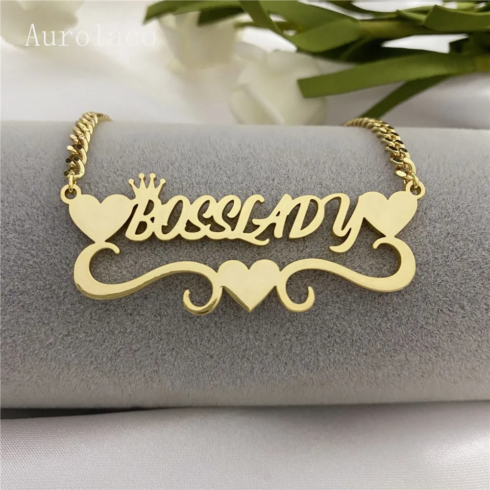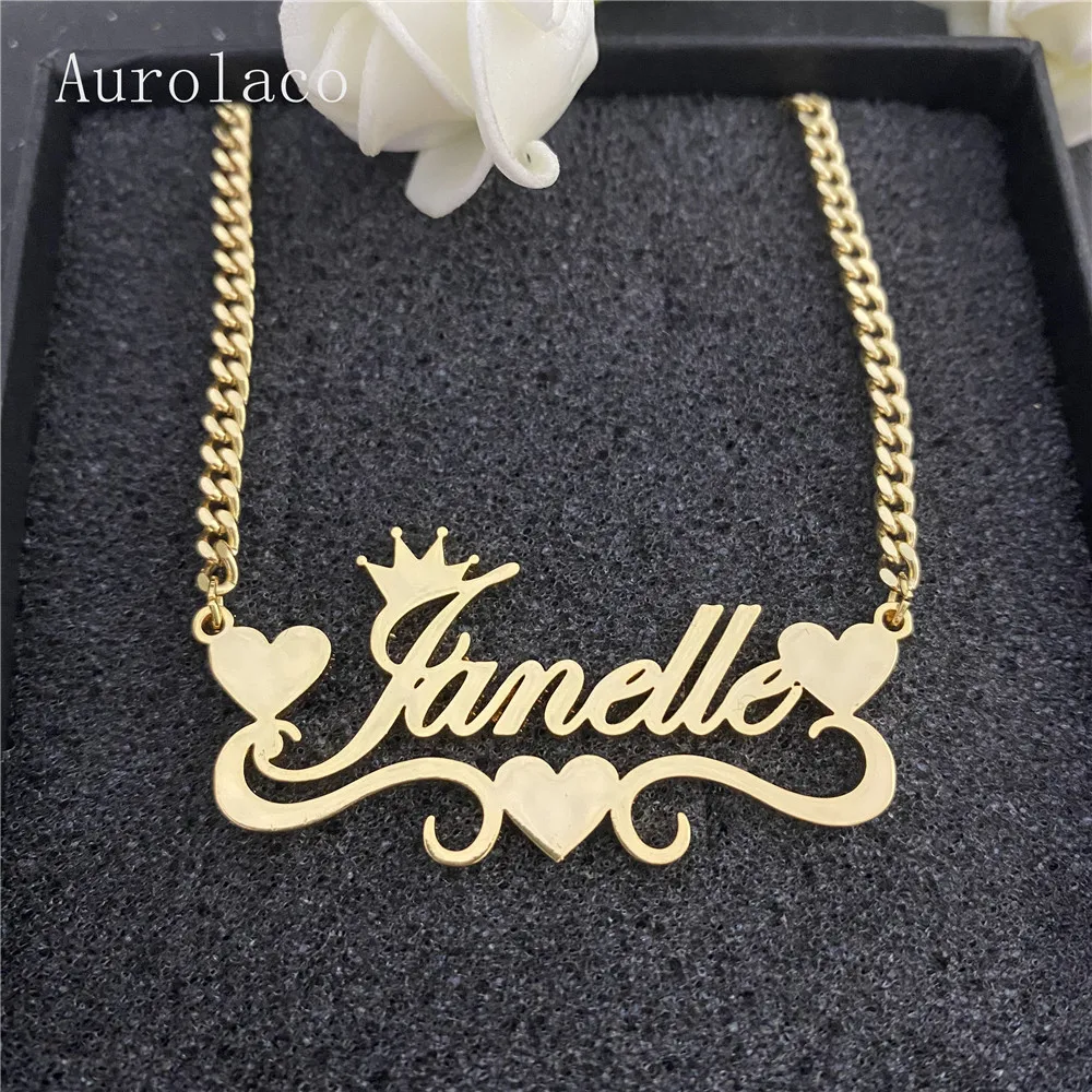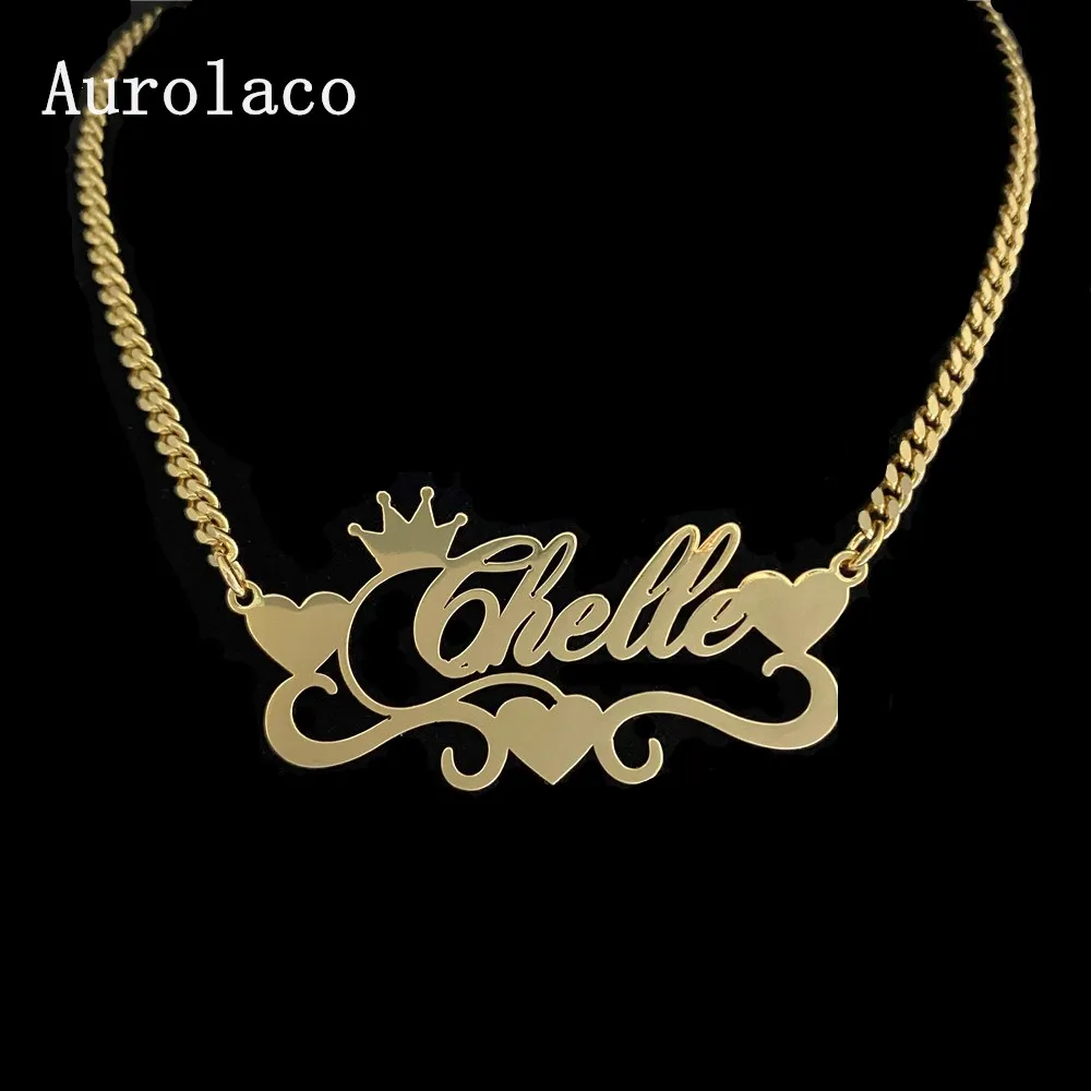 Ожерелье AurolaCo с именем на заказ с сердцем, персонализированное ожерелье из нержавеющей стали с золотой именной табличкой, кубинская цепочка, ожерелье для женщин, подарок