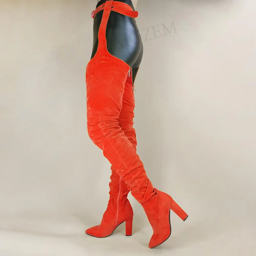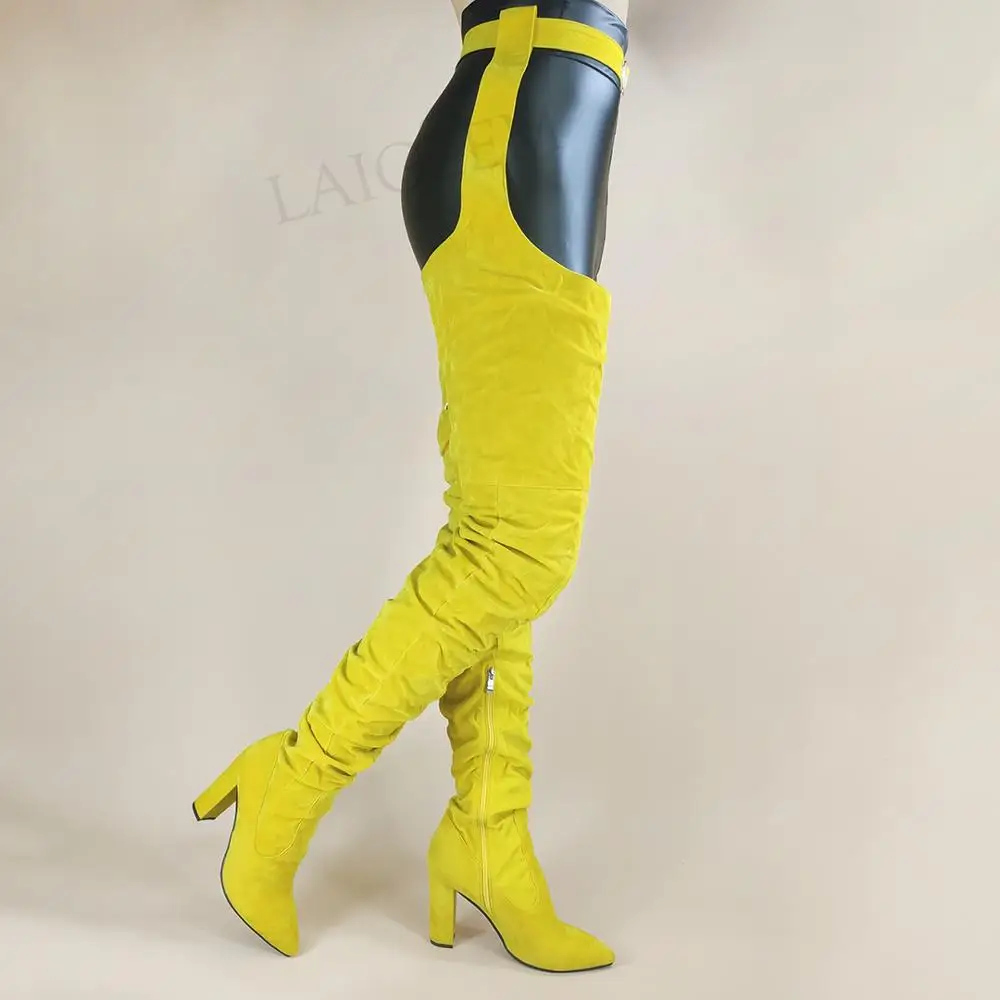 LAIGZEM SUPER Women Thigh High Chap Boots Faux Suede Belted Side Zip Chunky Heeled Boot Back Zip Shoes Woman Big Size 42 43 47