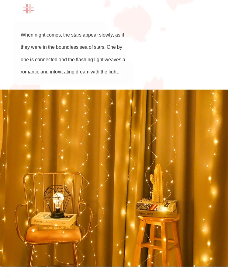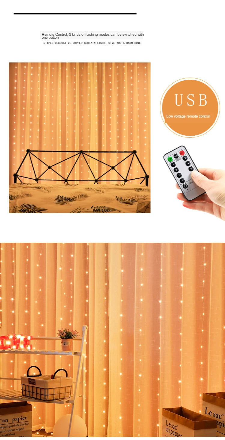 Стиль изделия: теплый белый/цвет/белый Спецификация: 3*3 м 300 светодиодов/3*2 м 200 светодиодов/3*1 м 100 светодиодов Источник питания: USB 5 В Применение: Гавайские вечерние, семейные, свадебные, украшения на день рождения, Рождество, новогодние украшения Режим работы: Поддержка дистанционного управления Примечание: 1. Поскольку указанные выше размеры измеряются вручную, фактический размер, который вы получите, может немного отличаться от указанных выше размеров. В то же время обратите внимание, что из-за таких факторов, как световые эффекты, яркость дисплея, настройки контрастности и т. д., могут быть небольшие различия между тоном изображения и реальным проектом.