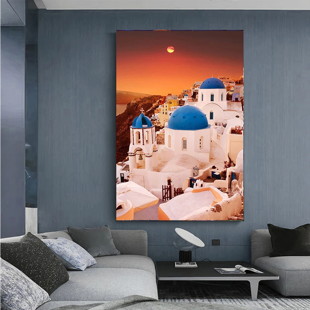 Голубые купола церквей на закате пейзаж ручной работы со стразами картина Санторини Алмазная вышивка крестиком Стразы мозаичная картина, выполненная в технике