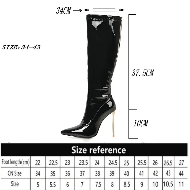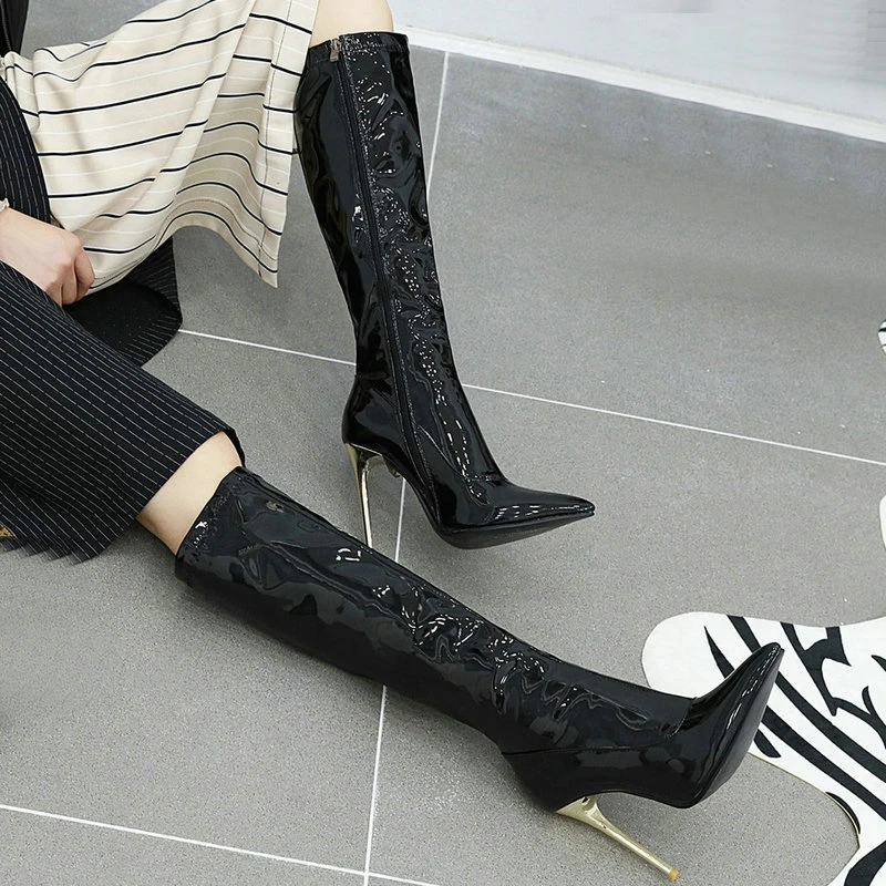 Осенне-зимние женские сапоги до колена из лакированной кожи, женские длинные сапоги с острым носком на шпильке, привлекательная Женская обувь черного и белого цвета