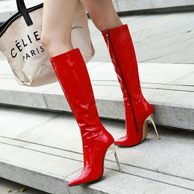 Сапоги женские зимние до колена, красные, из лакированной кожи, 2019