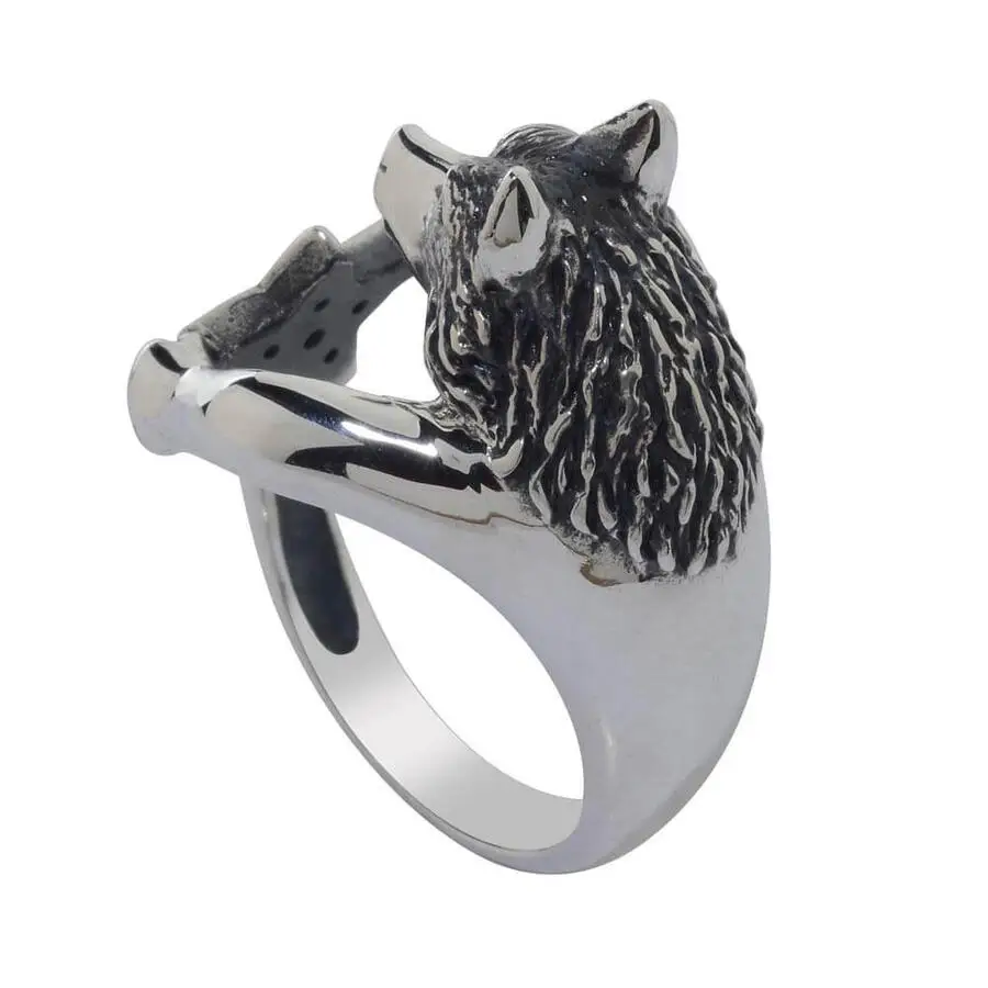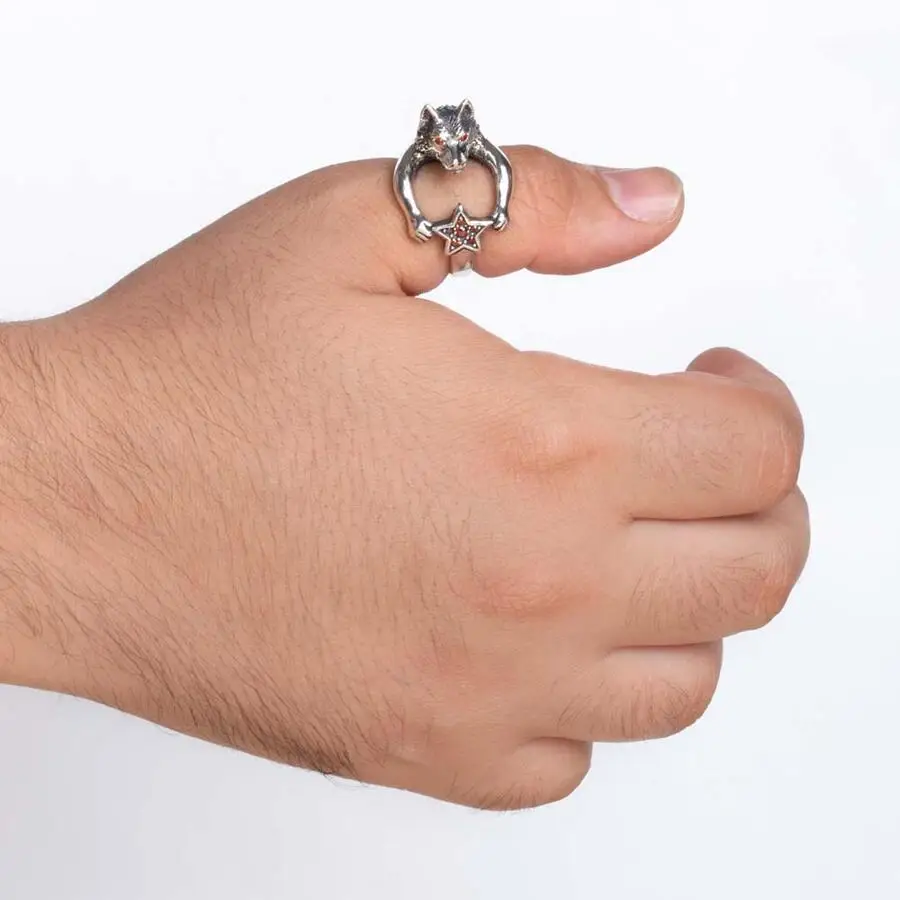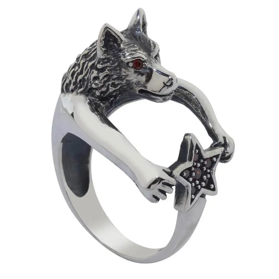 Серебряное кольцо с животным, волком, звездой, винтажным цирконом, мужское серебряное кольцо, Сделано в Турции, однотонное искусственное серебро