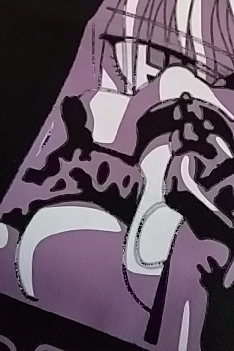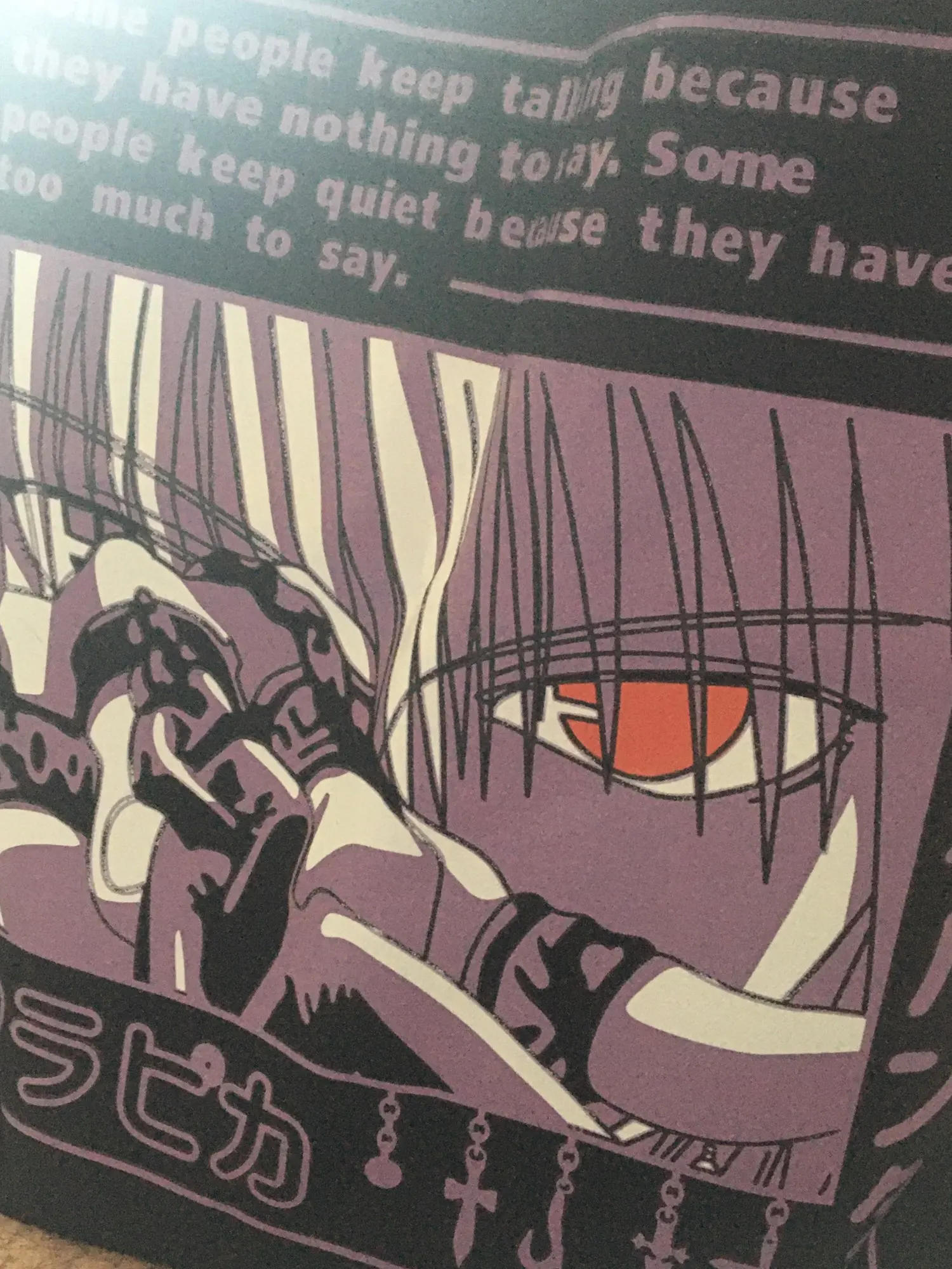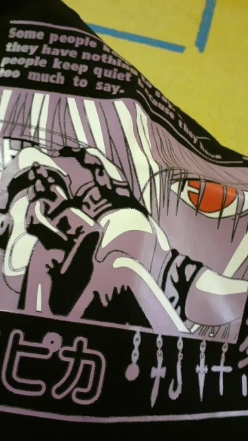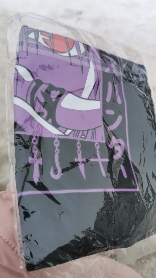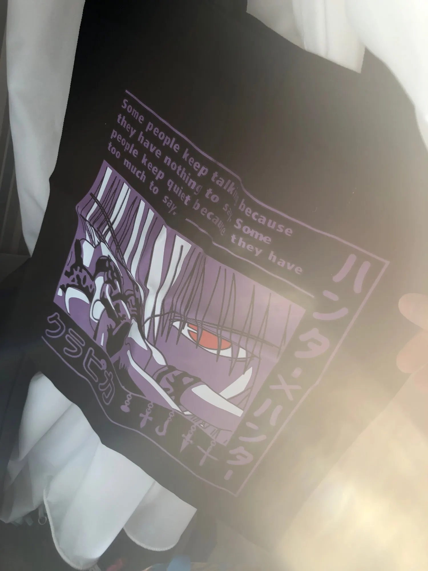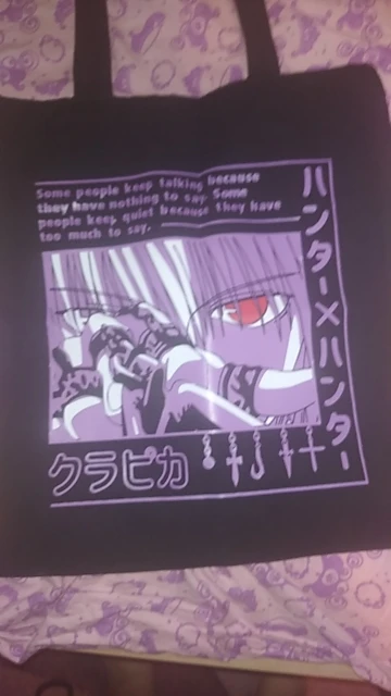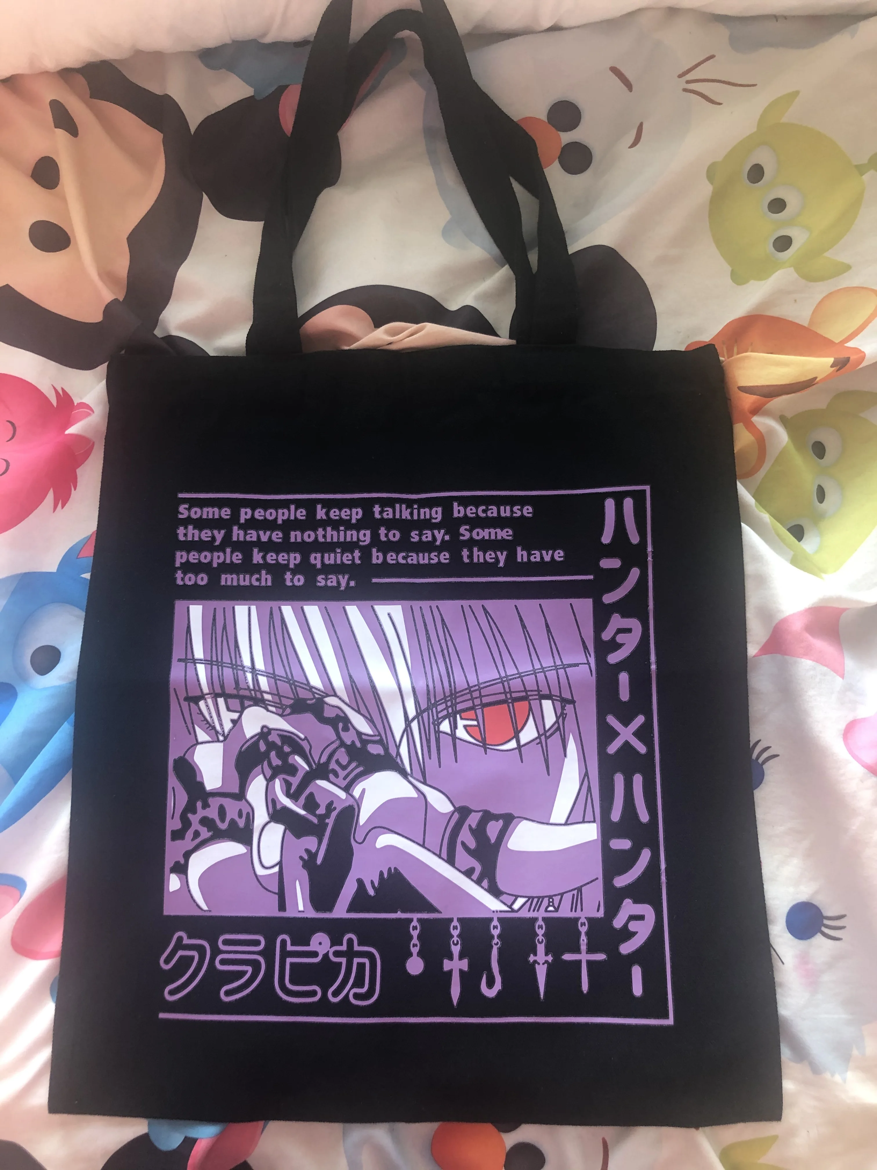 шоппер пришел мой день рождение и это очень здорово! шоппер довольно таки неплохой, но принт потрескался и левый глаз Курапики должен быть черным, а не фиолетовым. из далека он выглядит круто, но вблизи видно погрешности принта.