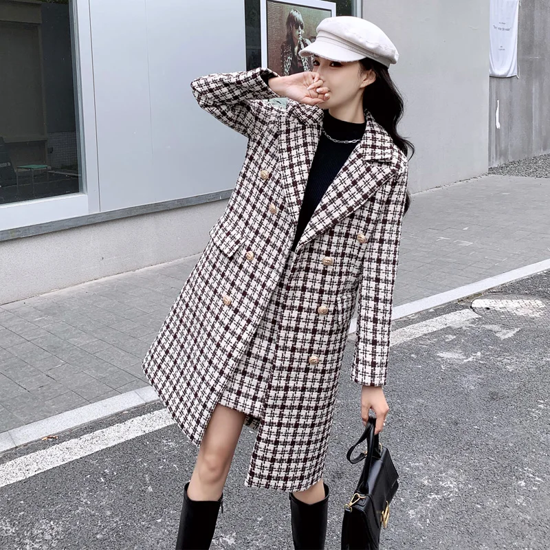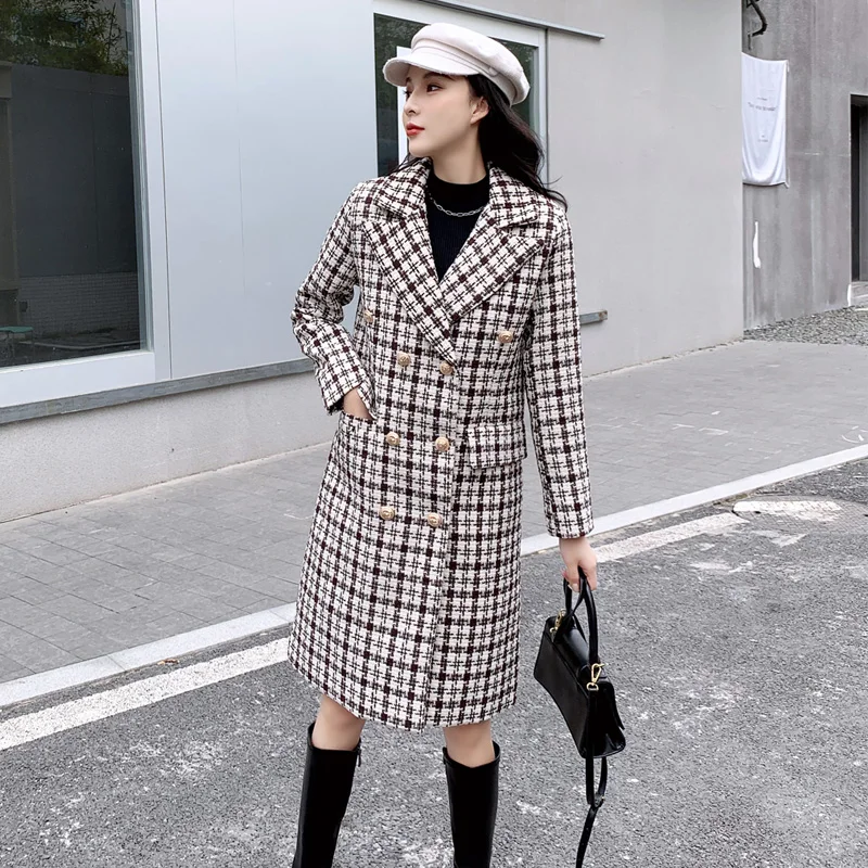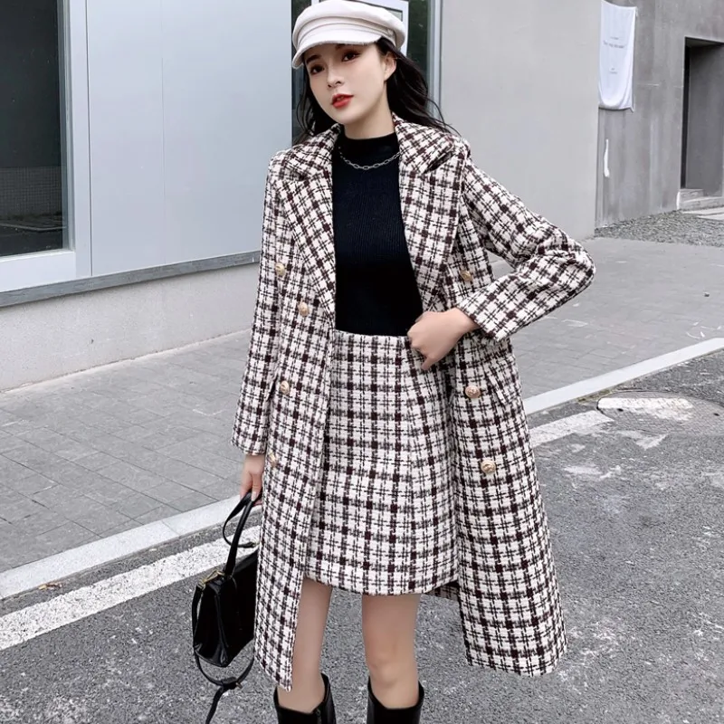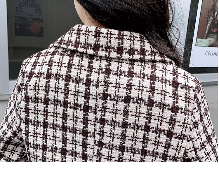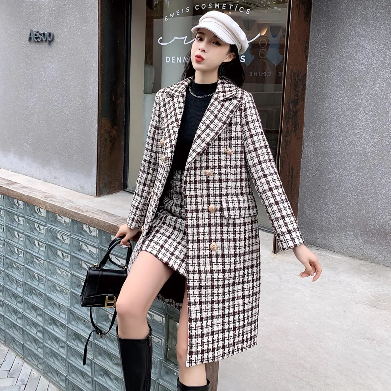 Женский твидовый костюм в клетку, элегантный двубортный длинный шерстяной пиджак и юбка мини, Осень-зима 2020