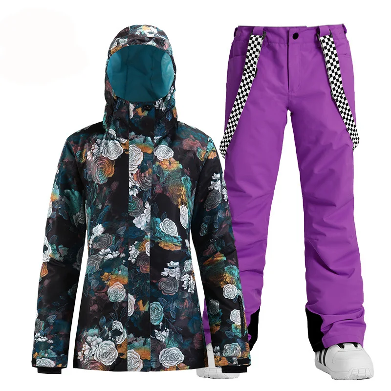 Женский зимний костюм с черными цветами, уличные спортивные лыжные костюмы, водонепроницаемые комплекты одежды для сноуборда, куртка + штаны для девочек,-30