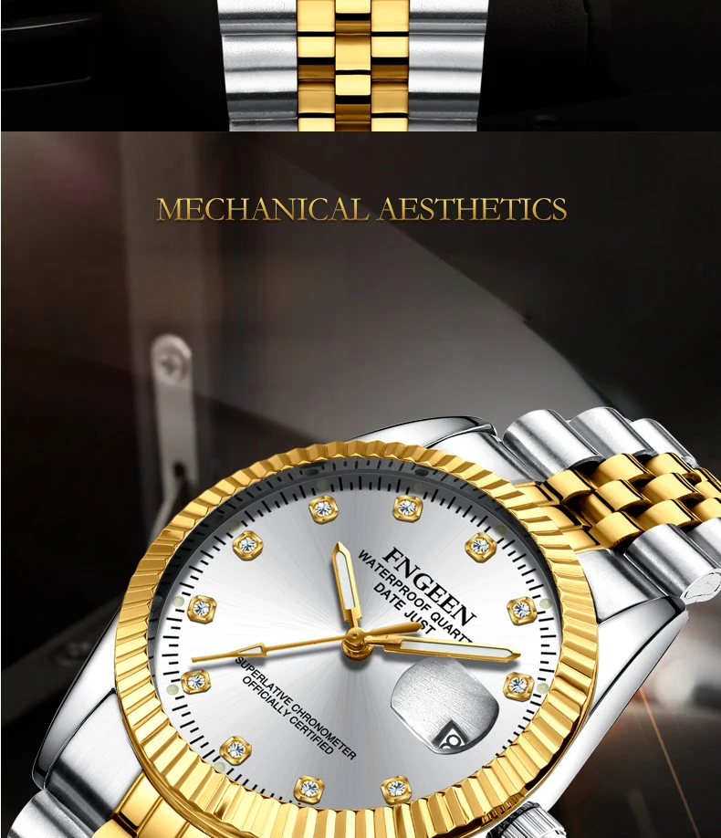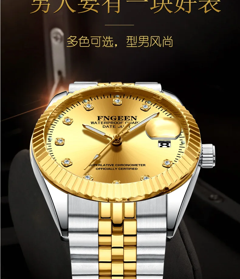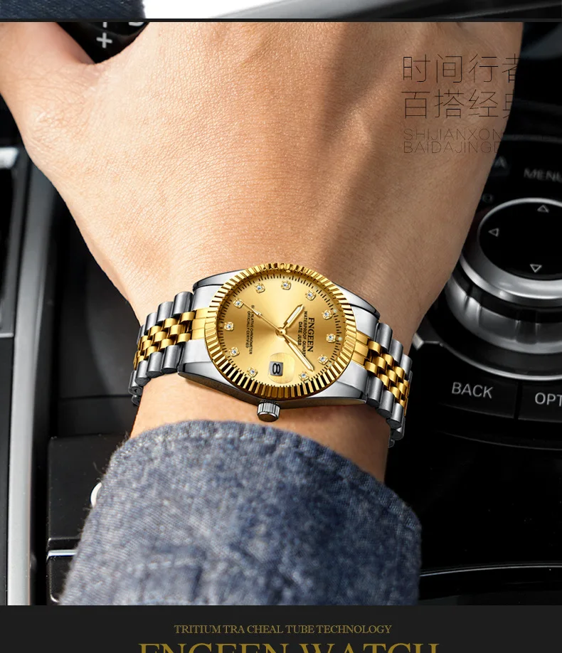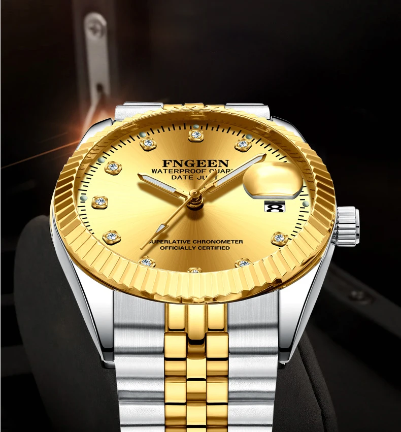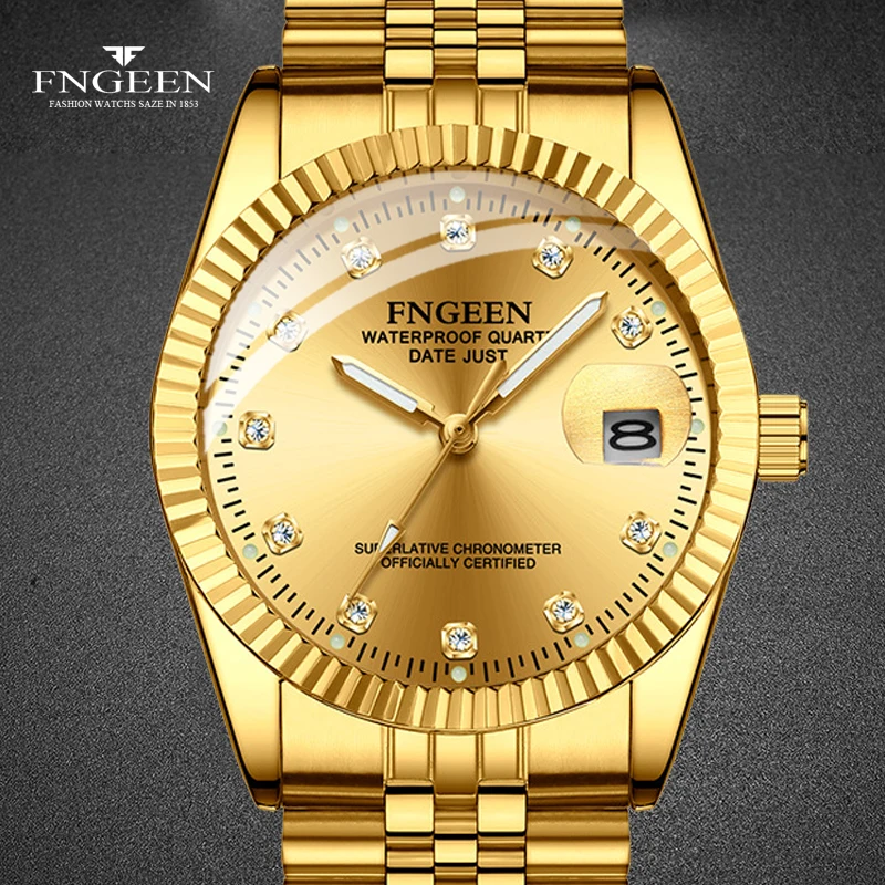 Часы наручные FNGEEN Мужские кварцевые, брендовые золотистые водонепроницаемые в деловом стиле, с датой, с календарем
