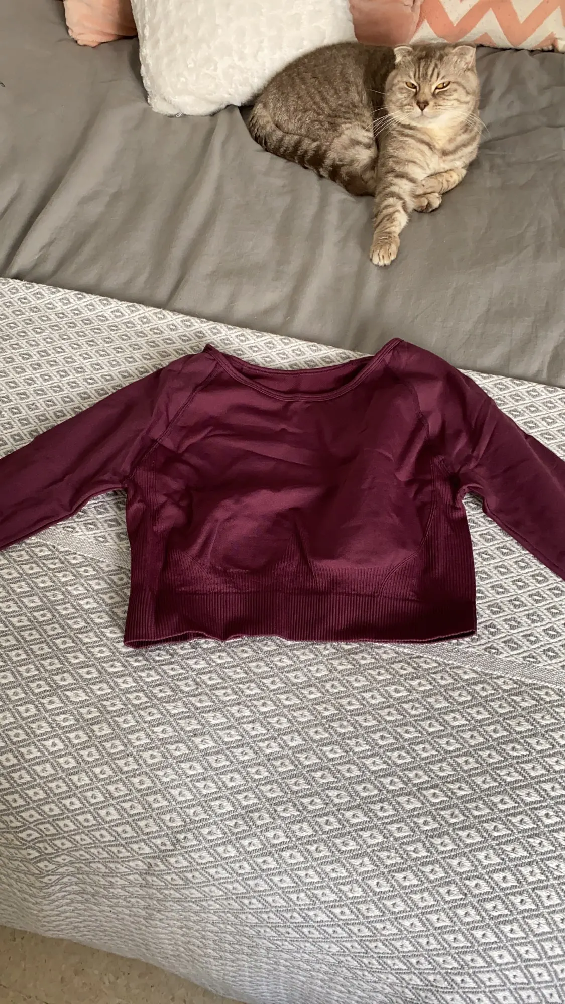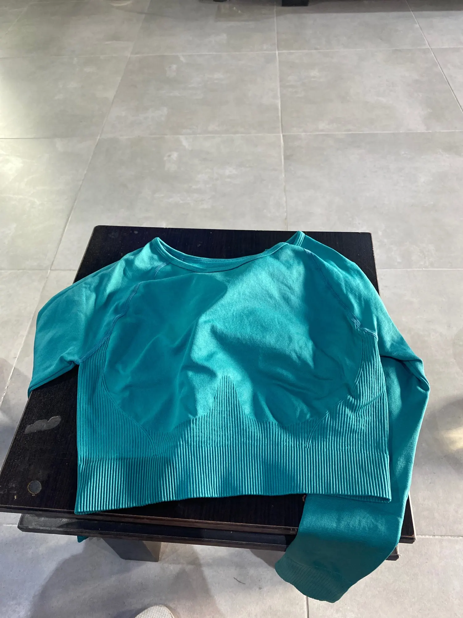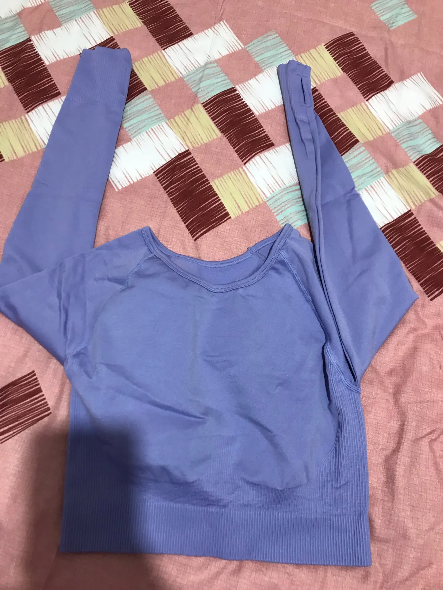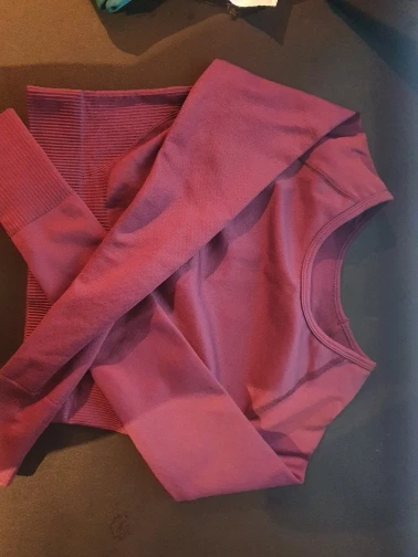 Zamówienie otrzymałam w niecały miesiąc od złożenia zamówienia. Nie doczytałam, że przedmiotem sprzedaży jest sam top, bez spodni do ćwiczeń - ale to mój błąd przez niedopatrzenie. Kolor topu jest przepiękny, na takim mi zależało. Pięknie układa się na ciele, dobrze opina i ogromny plus za wycięcie na kciuki w rękawach - dobrze wykończone, nic nie odstaje, zero wystających nitek. Materiał typowy dla strojów sportowych, dopasowywuje się do sylwetki. Jak na top z długimi rękawami jest naprawdę komfortowy i wygodnie mi się w nim ćwiczy. Używam go cały czas do cardio i tabat i sprawdza się świetnie. Po kilku praniach nadal spełnia swoją funkcję w 100%. Gorąco polecam. Jakość jest bardzo dobra :)