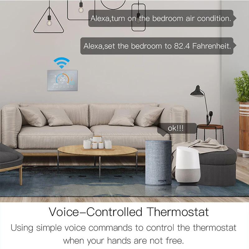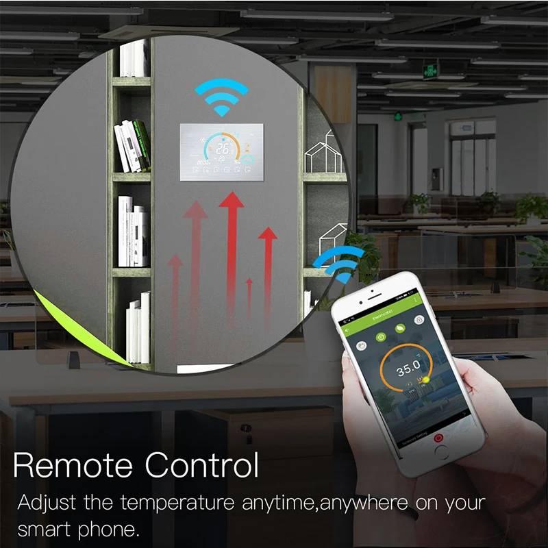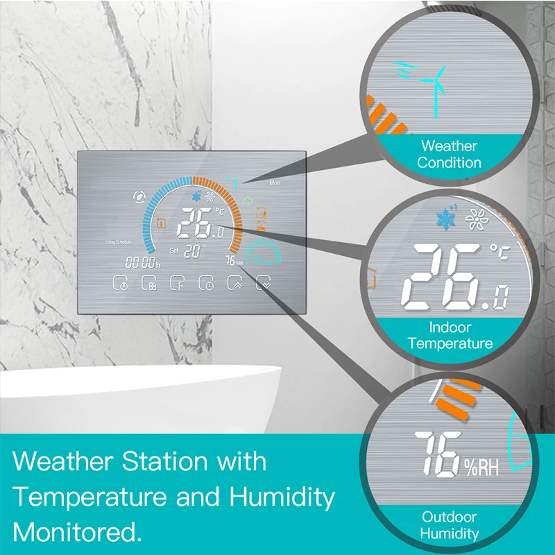 WiFi Термостат Программируемый Регулятор температуры подпольное водонагревание/Электрическое отопление/водный газовый котел Погодная станция Tuya Smart Life беспроводной пульт дистанционного управления работает с Alexa Google Home Голосовое управлениеОсновные характеристики:1. Функциональная система отопления:Контроль с помощью протокола Tuya Wi-Fi включен для интеллектуального водного пола, электрического отопления и водного газового котла, система отопления, легко контролировать температуру в помещении и влажность на открытом воздухе от метеостанции на термостате. Фокусируясь на создании простых, человеческих, восхитительных ощущений для вашего дома, и этот вид цвета подходит для различных стилей украшения.(Примечание: текущая нагрузка составляет 5А для нагрева воды и газового котла, 16А для электрического напольного отопления.)2. Металлическая матовая панель с погодной станцией поддерживается:Температура в помещении и наружная Влажность/Ультрафиолет отслеживаются и отображаются на ЖК-экране, выдерживают 3-4 минуты после подключения, просматривая местную погоду, включая температуру в помещении и уровень относительной влажности на открытом воздухе, А также состояние ветра.Потрясающая Серебристая Рамка и прямоугольный дисплей помогают защитить ваши глаза четким цифровым дисплеем по Фаренгейту или Цельсию по желанию, предназначены для удобства использования и подходят для любого стиля комнаты, 1 ℃ точность сохраняет температуру в пределах установленного Вами уровня.(Примечание: отображаемая влажность, погода и ультрафиолет предназначены для наружных данных от метеостанции.)3. Умный дом совместим:Работая с Alexa Google Home, этот новый термостат обеспечивает наиболее удобную температуру для вашего дома с помощью простой голосовой команды, освобождая руки намного проще.4. Пульт дистанционного управления для смартфона:Удаленное управление температурой вашего дома для достижения улучшенного комфорта с помощью приложения Tuya/ Smart Life, легко работать на ваших смартфонах в любом месте. Нет ограничений для добавления термостатов в приложение и поддерживаемых смарт-сцен.5. 5 + 1 + 1 Шесть циклов программирования:Поддерживает полные автоматические программы или ручную настройку 5 + 1 + 1 дней еженедельного расписания 4 этапов ежедневно, обеспечивая вам максимальное удобство для различных ситуаций. Память данных при выключении.Параметр:Источник питания: 95-240 В переменного тока, 50-60 ГцРеле клапана Ампер: Сопротивление: 3A/индуктивный: 1AТочность: ± 1 ℃Температура экрана. Диапазон: 5 ~ 99 ℃Влажность окружающей среды: 5 ~ 95% RH (без конденсации)Тип: теплый пол/котел TermostatoПроисхождение: CN (происхождение)Реле вентилятора Ампер: Сопротивление: 5A/индуктивный: 3AСенсор: NTC3950, 10KУстановите температуру. Диапазон: 5 -35 ℃Температура окружающей среды: 0 ~ 45 ℃Цвет: белый, черный TermostatoПриложение: Smart Life Tuya
