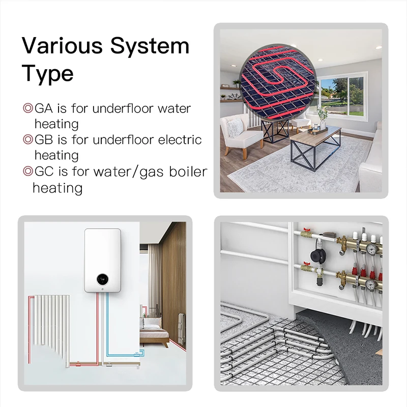 Различные типы системGA для подогрева воды под поломGB для напольного электрического отопленияGC для нагрева воды/газового котла