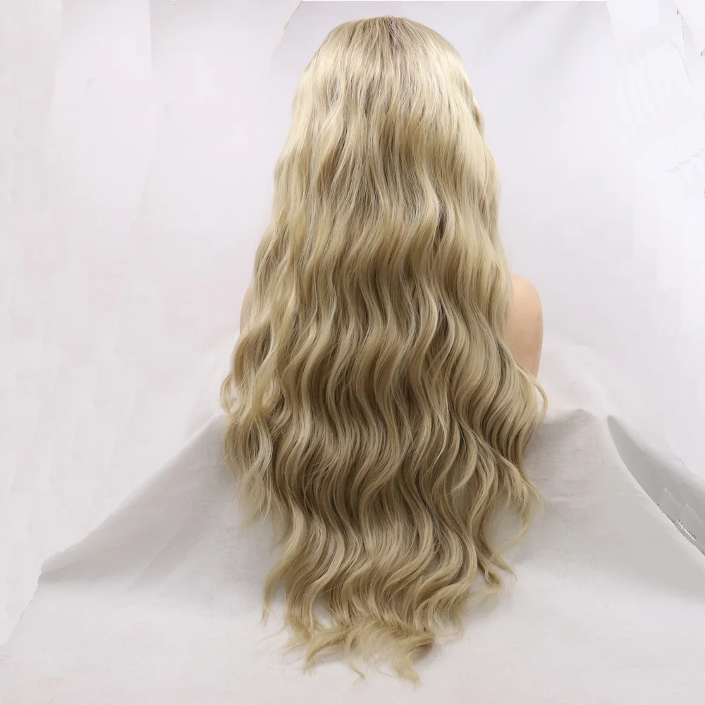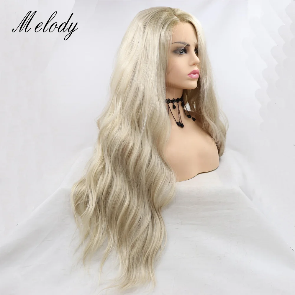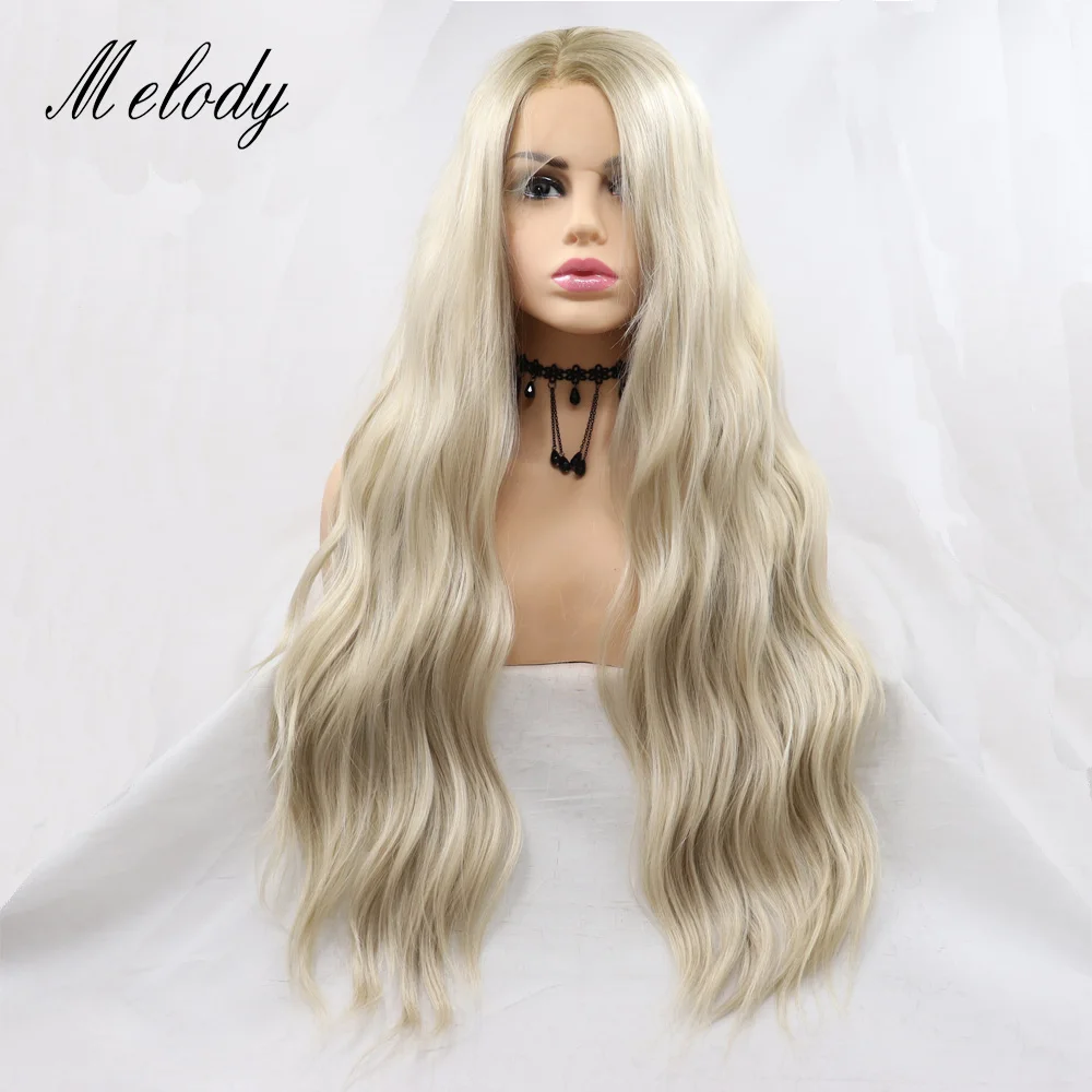 Длинный светлый волнистый парик Melody с коричневыми корнями, синтетические парики на шнурке спереди, боковая часть, Длинный мягкий волнистый парик, сменные волосы для женщин