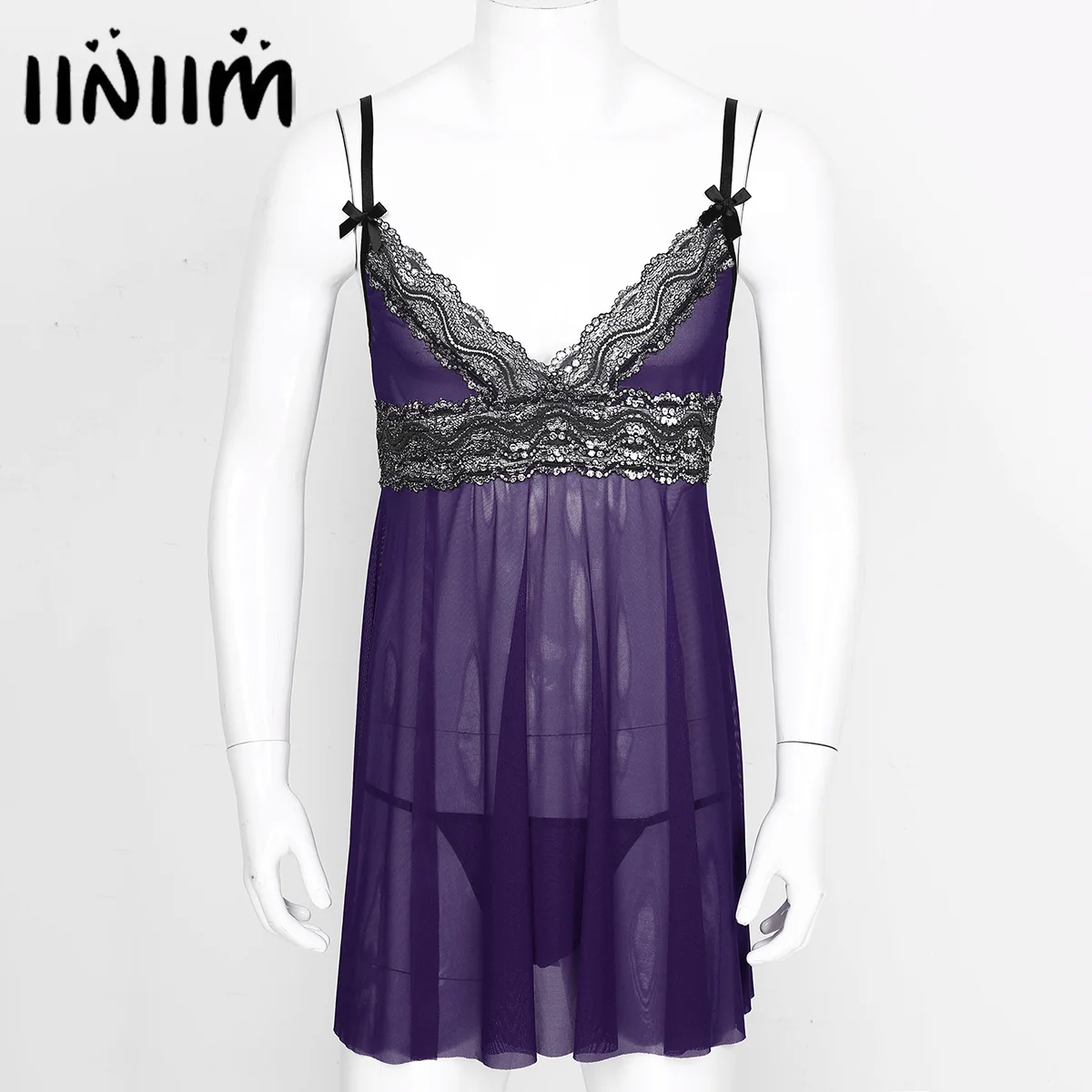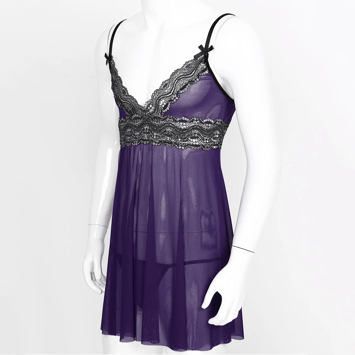 Мужские Сисси пеньюары прозрачное кружевное Сетчатое Женское ночное костюмы регулируемыми бретельками кружевной отделкой сорочка, одежда для сна