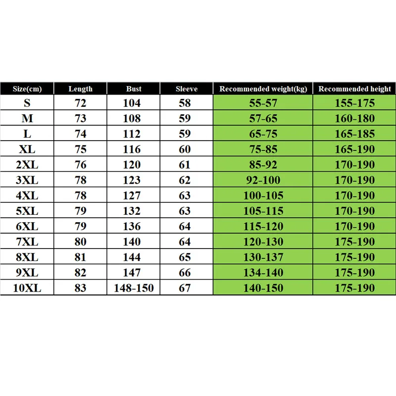 10XL длина: 83 бюст: 148-150 рукав: 67 рекомендуемый вес (кг):140-150 рекомендуемый рост: 175-190