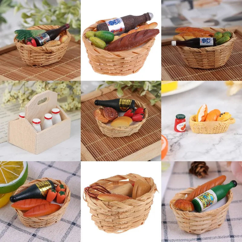 1 Набор 1:12 миниатюрная еда для кукольного домика, бутылка вина, хлеб, овощи, фрукты, бамбуковая корзина для куклы, кухонный Декор