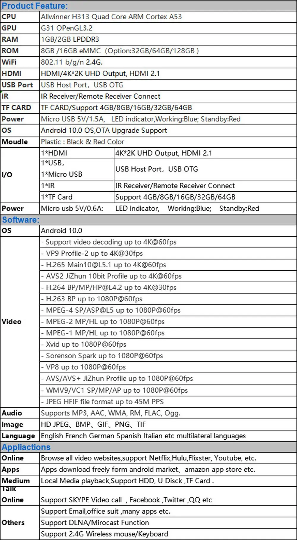 Описание товара: 1, четырехъядерный процессор Allwinner H313 ARM Cortex A53; 2, GPU: G31 OPenGL3.2; 3, ОС Android 10,0; 4, ОЗУ/ПЗУ: 1 ГБ/8 ГБ, 2 ГБ/16 ГБ; 5, поддержка H.265, 4K @ 60fps, HDR, USB2.0, HD2.0; 6, поддержка 2,4G Wifi; 7. Поддержка функции беспроводного обновления прошивки (OTA). 8, два варианта для X96 S400 TV Stick: A: 1 Гб + 8 Гб + 2,4 ГГц Wi-Fi (без BT) B: 2 Гб + 16 ГБ + 2,4 ГГц Wi-Fi (без BT)