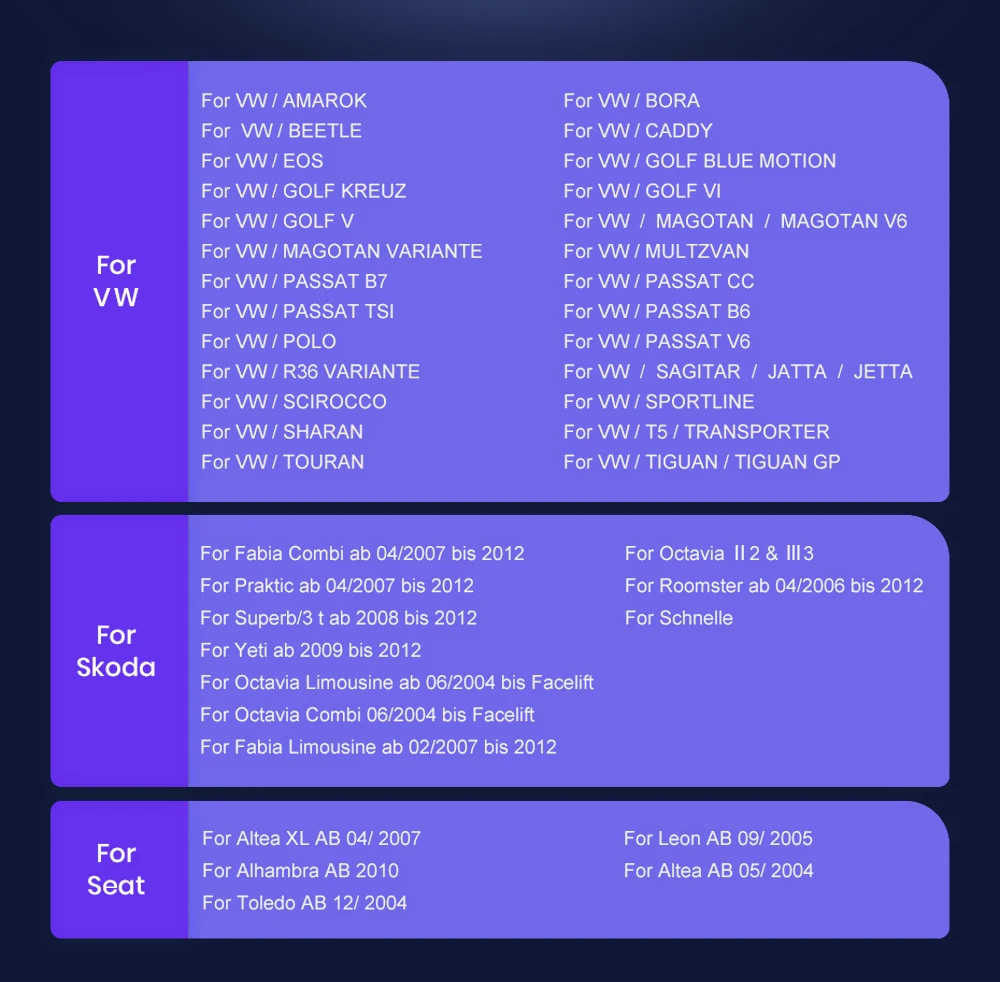 Для Volkswagen:Для Amarok (2010-2015), Beetle (2011-2015), Bora (Jetta) (2005-2015),Caddy (2004-2015), EOS (2006-2015), golf MK5 / V5 / A5 / 1K (вариант/GTI/универсал) (2003 - 2009), Golf MK6 / VI6 / A6 / 5K (GTI / Wagon / R / Variant / Estate / Cabriolet) (2008-2013), Golf Plus (2004-2013), Jetta V / A5 / 1K (2005-2009), jetta Vl / A6 / 1B (2010-2015), Passat B6 / 3C (универсал/седан/вагон) (2005-2010), Passat B7 / 3C (универсал/седан/вагон/Alltrack) (2010-2014), Passat CC (2008-2011), Polo MK5 / 6R(GTI/седан)(2009-2014), Scirocco Mk3 (2008-2011), Magotan (2007-2013), Sharan (2010-2014), Touran (2003-2014), tiguan (2007-2013), T5 Multivan (2010-2013), T5 Transporter (2010-2013), T5 Caravelle (2010-2015), Vento (2009-2015)Для SKODA:Для Fabia (2007-2014), Fabia Combi (2008-2014), Roomster (2006-2015), Octavia (2007-2012), Yeti (2009-2015), superb (2008-2015)Для сиденья:Alhambra (2010-2015), Altea (2004-2015), Altea XL (2007-2015), Leon Mk2 (2005-2012), Толедо (2004-2015)Лицевая панель: 220*210*130 мм