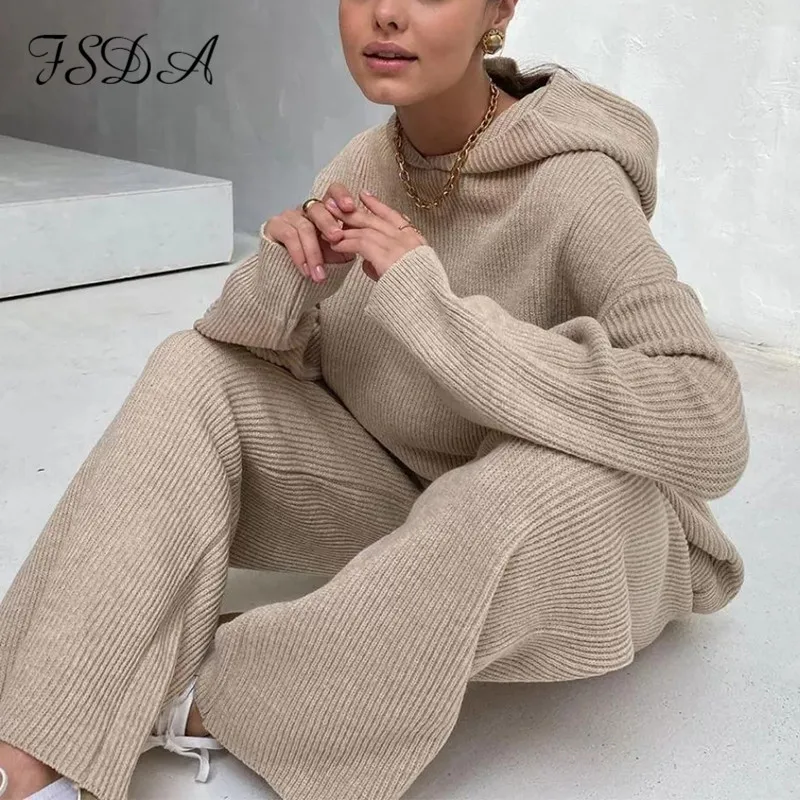 Женский вязаный костюм FSDA, свитер с длинным рукавом, с капюшоном и штаны, цвета хаки, повседневный костюм, белый костюм для вечеринки