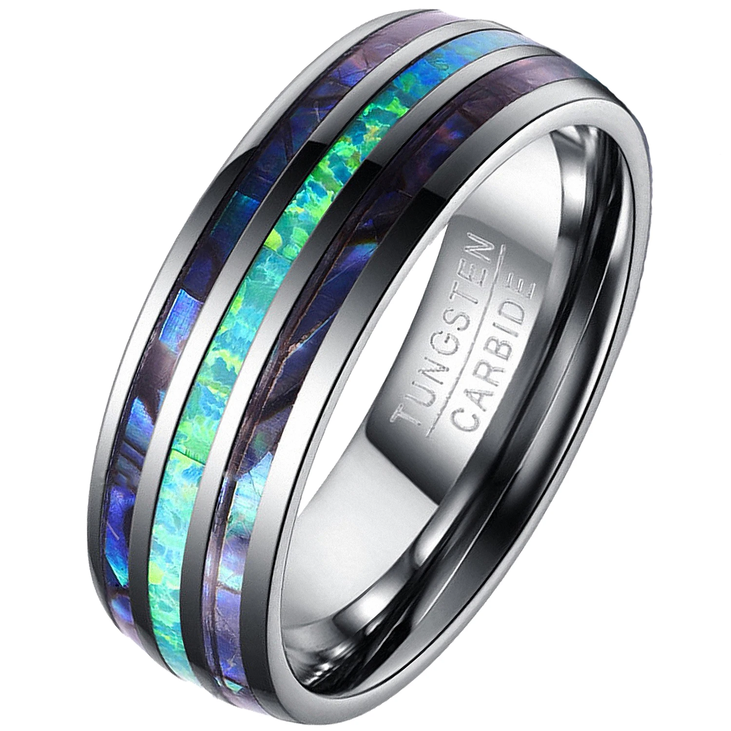 Роскошное обручальное кольцо из карбида вольфрама с опалом 8 мм, обручальное кольцо с морской раковиной, ручная работа, зеленый и синий огненный опал и морское ушко, полированное кольцо