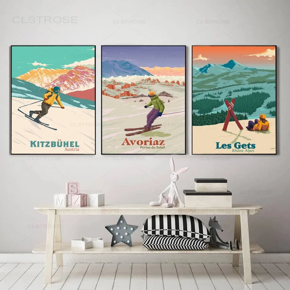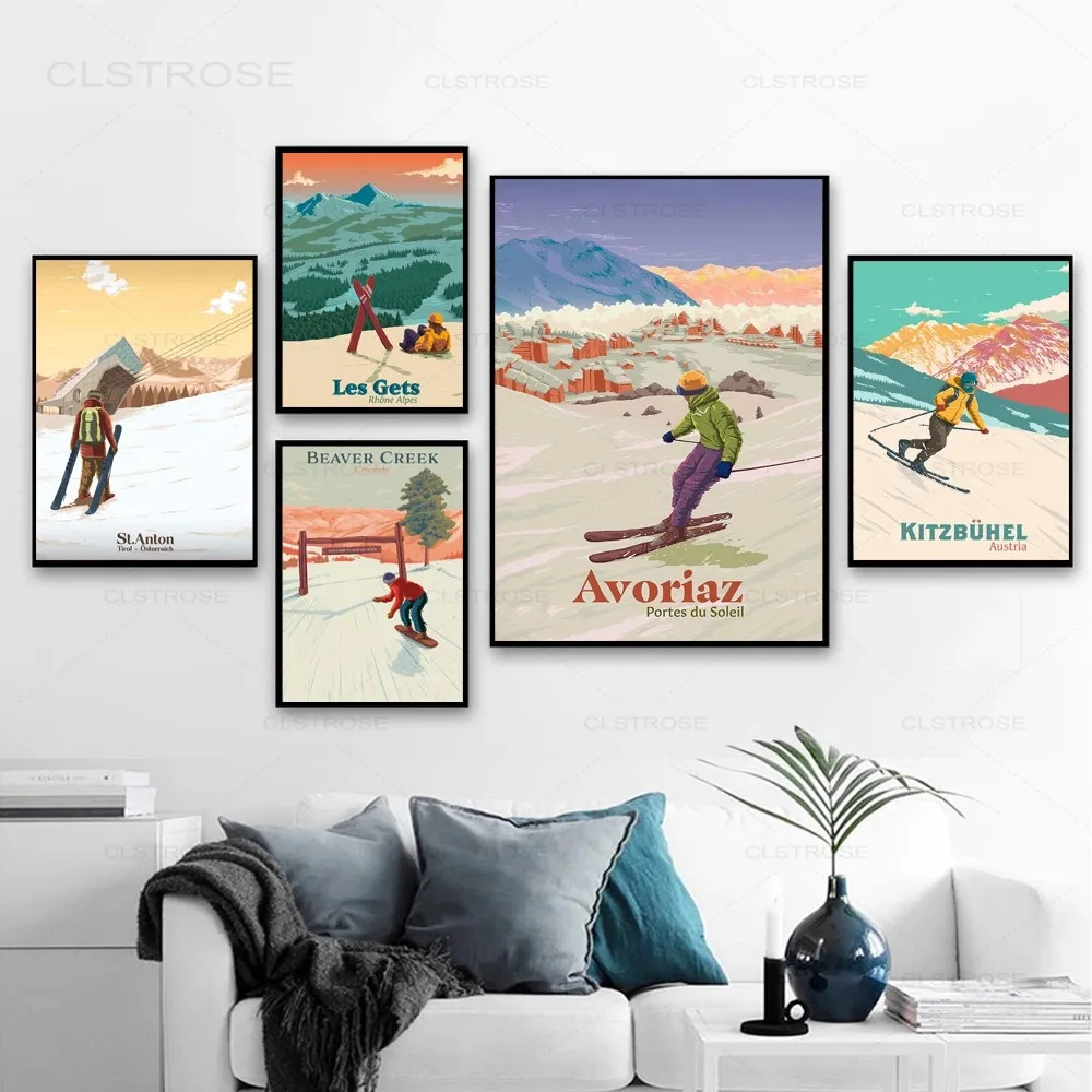 Плакаты для горнолыжного курорта St Anton Kitzbuhel Avoriaz, картины на холсте для катания на лыжах, Французских Альпах, сноуборде, винтажные настенные художественные картины