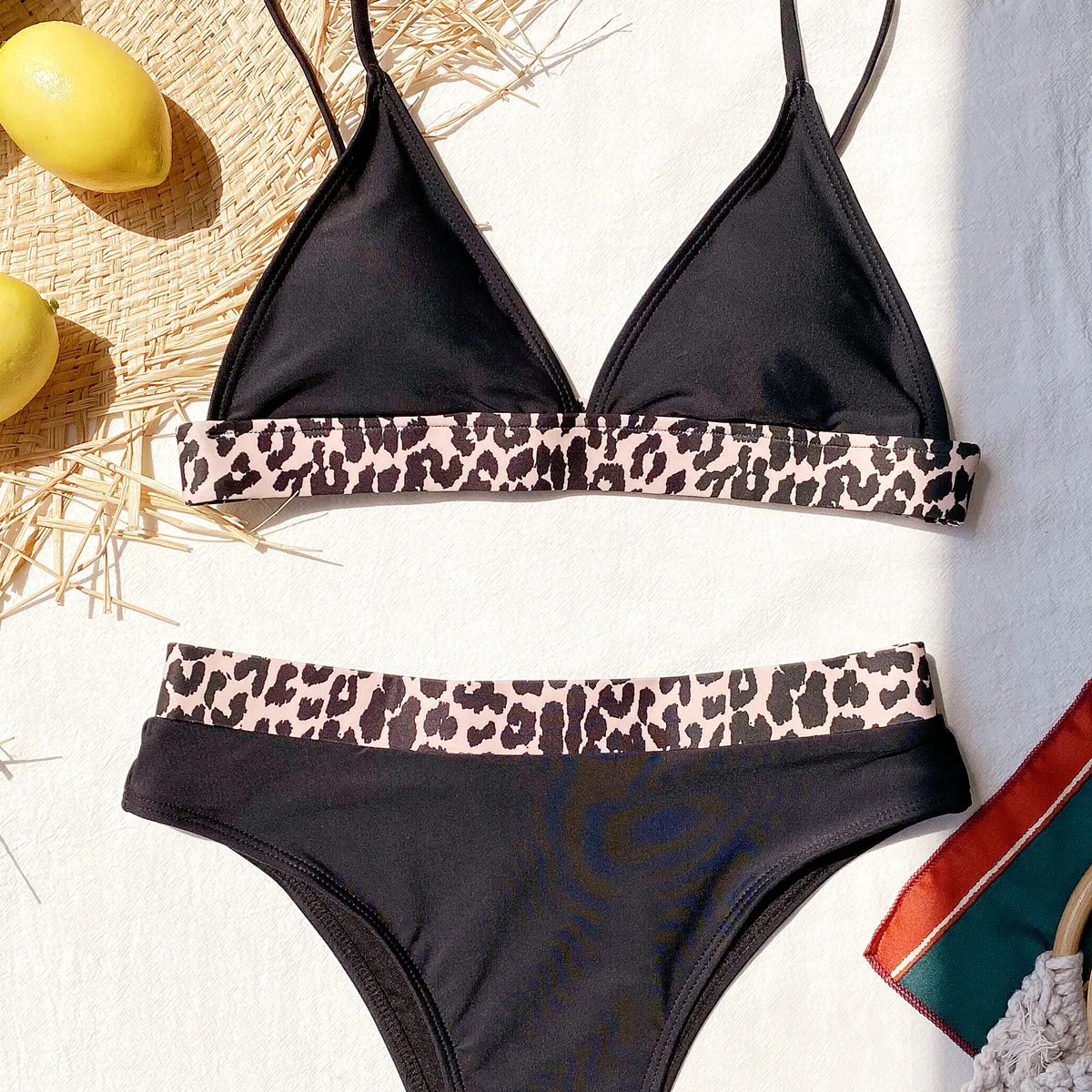 Черный леопардовый принт пэтчворк Треугольники Бикини Пляжные Для ж...