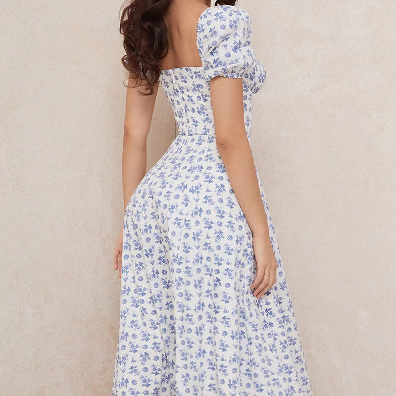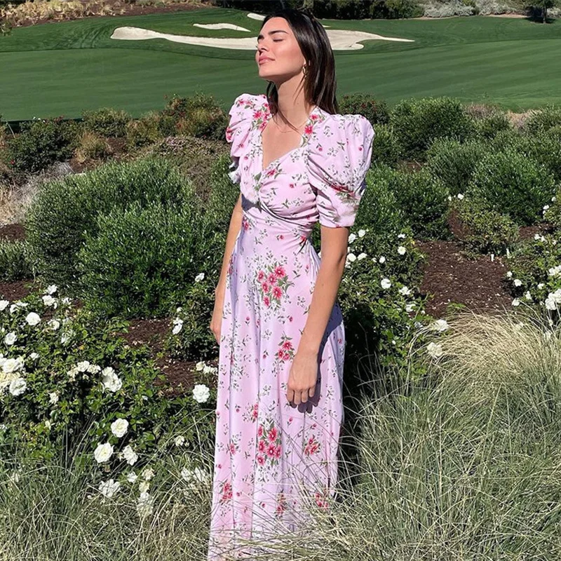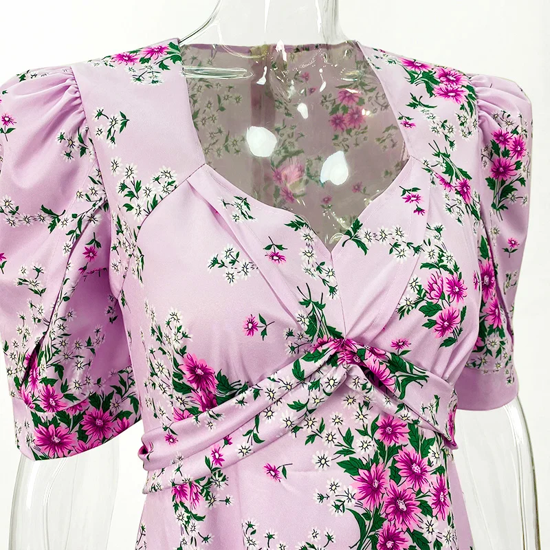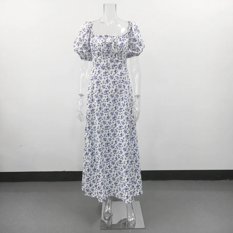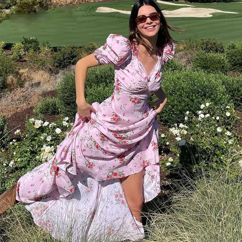 Платье женское длинное с цветочным принтом, с разрезом и рукавами-фонариками