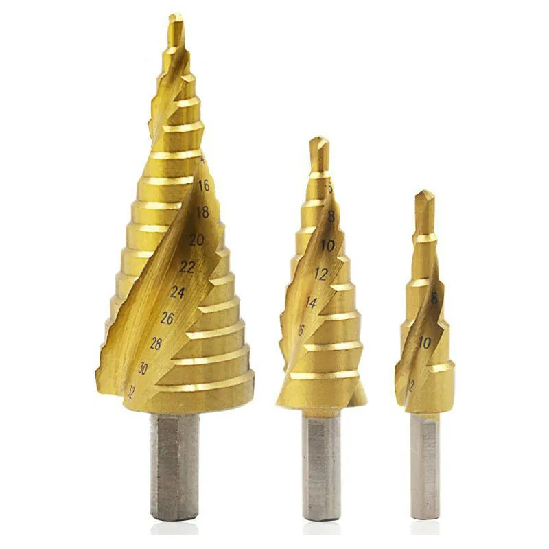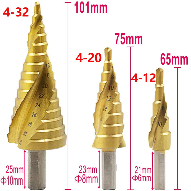 Hss титановые спиральные рифленые сверла с центральным шагом 4-12/4-20/4-32 мм ступенчатые конусные режущие инструменты набор стальных деревообрабатывающих металлических сверл