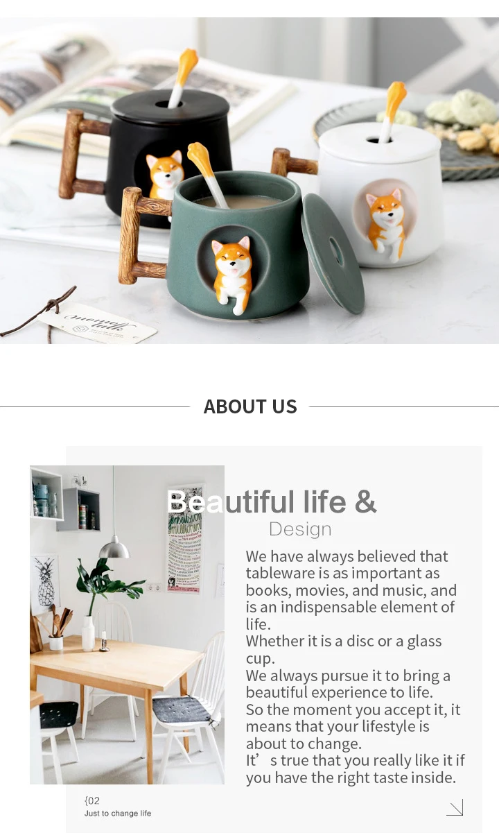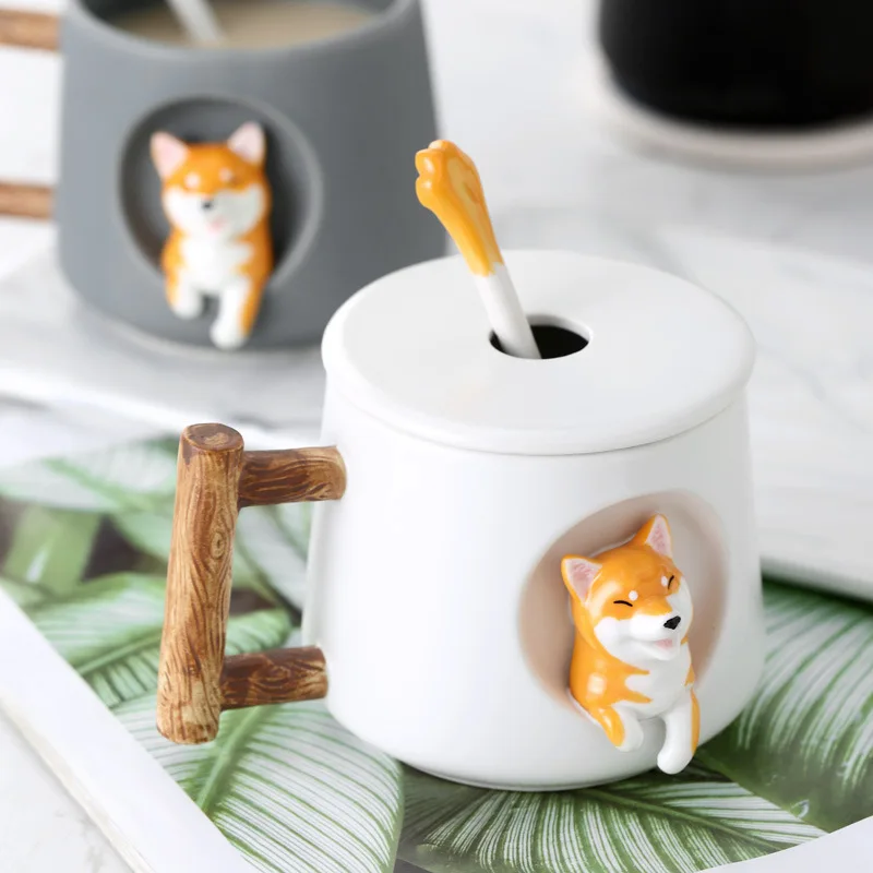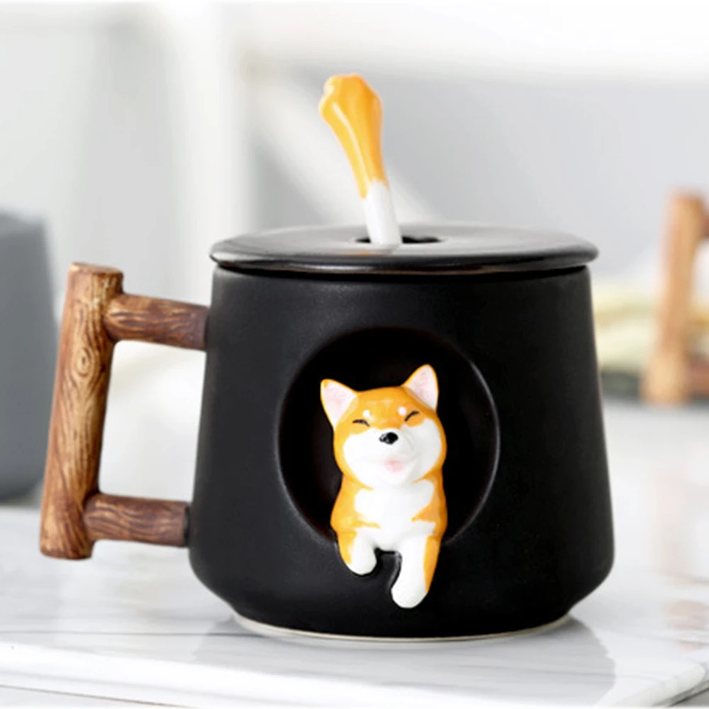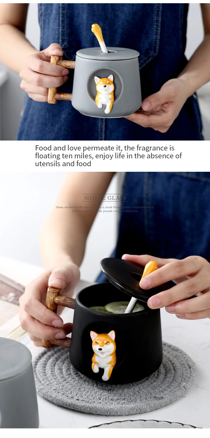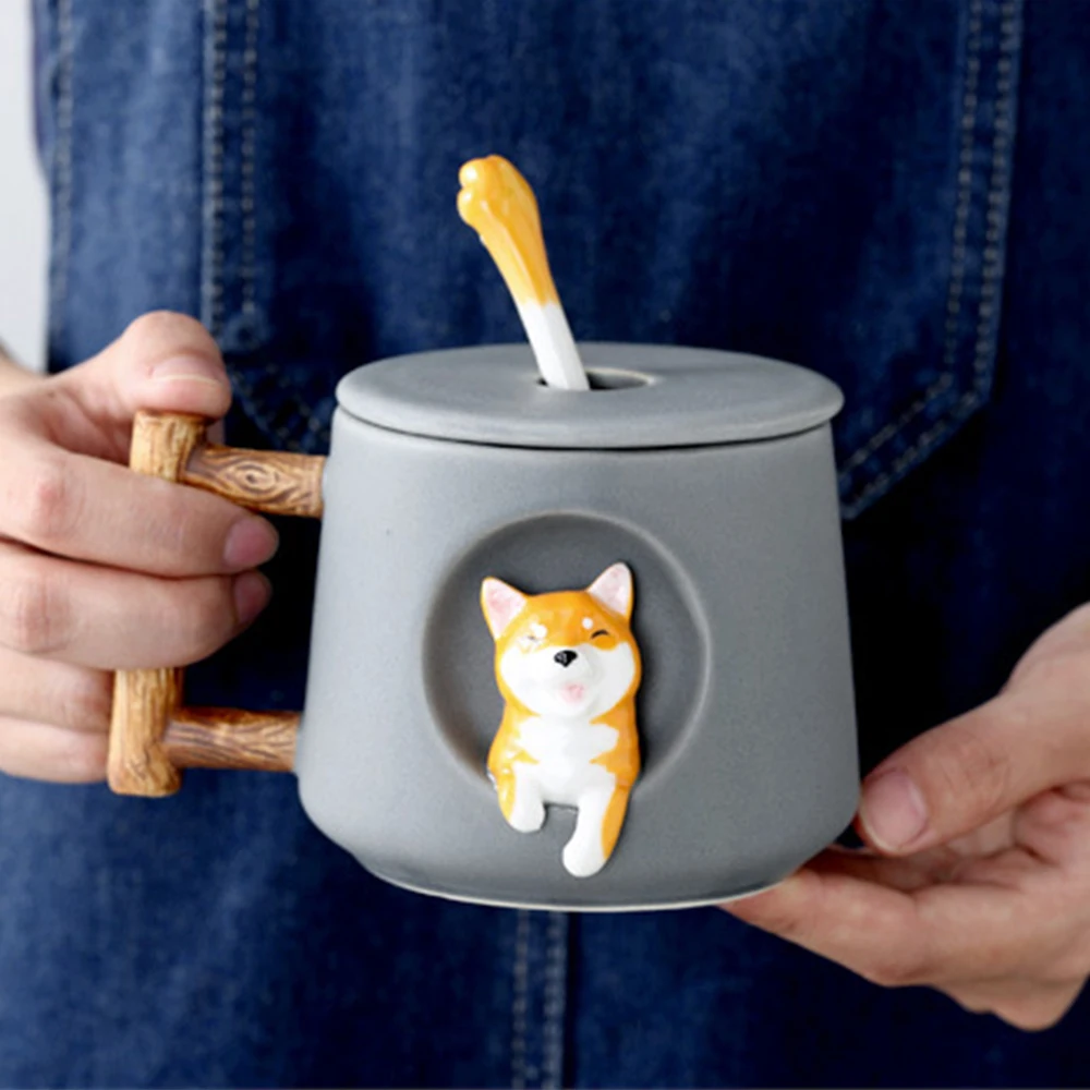 Мультяшная керамическая чашка, креативная кружка с крышкой, ложкой, трехмерная домашняя чашка для питья с собакой, чашка для кофе, молока, сока, завтрака