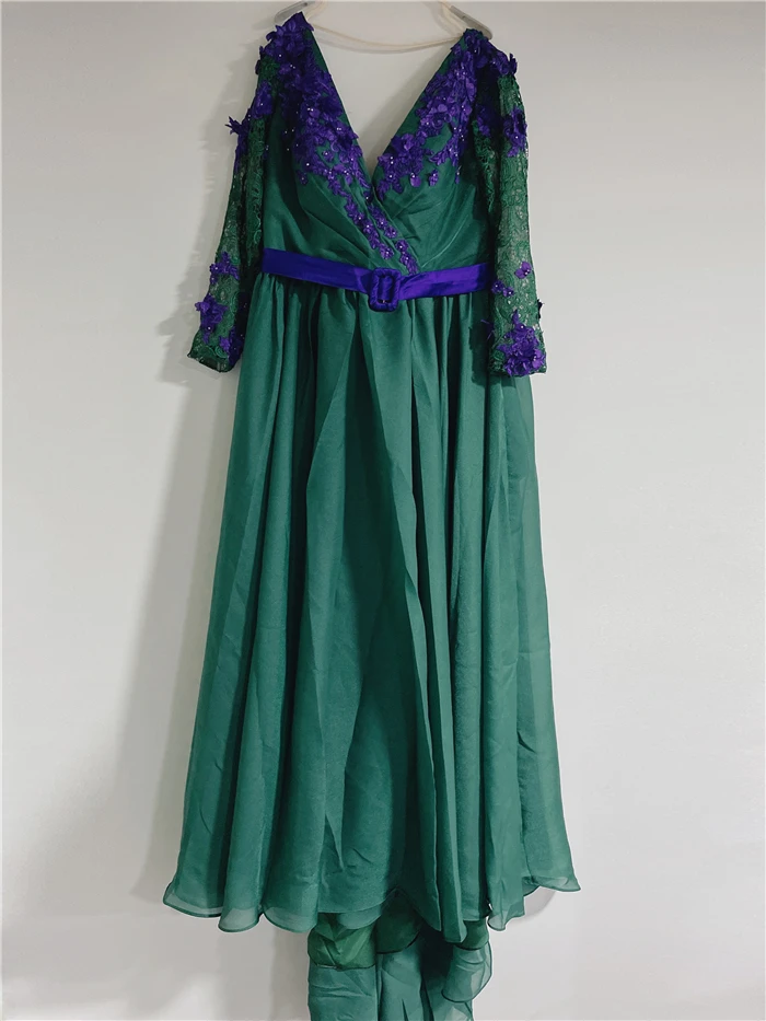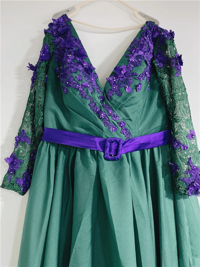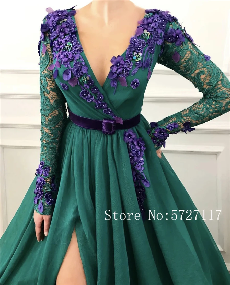 Вечернее платье ручной работы, с V-образным вырезом, фиолетовыми цветами, длинными рукавами и разрезом спереди, с поясом