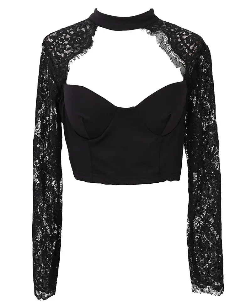 Модные женские сексуальные кружевные топы в стиле пэчворк, бюстгальтер пуш-ап с длинными рукавами, Сексуальная кружевная футболка укороченные женские топы, топы, тонкие Топы