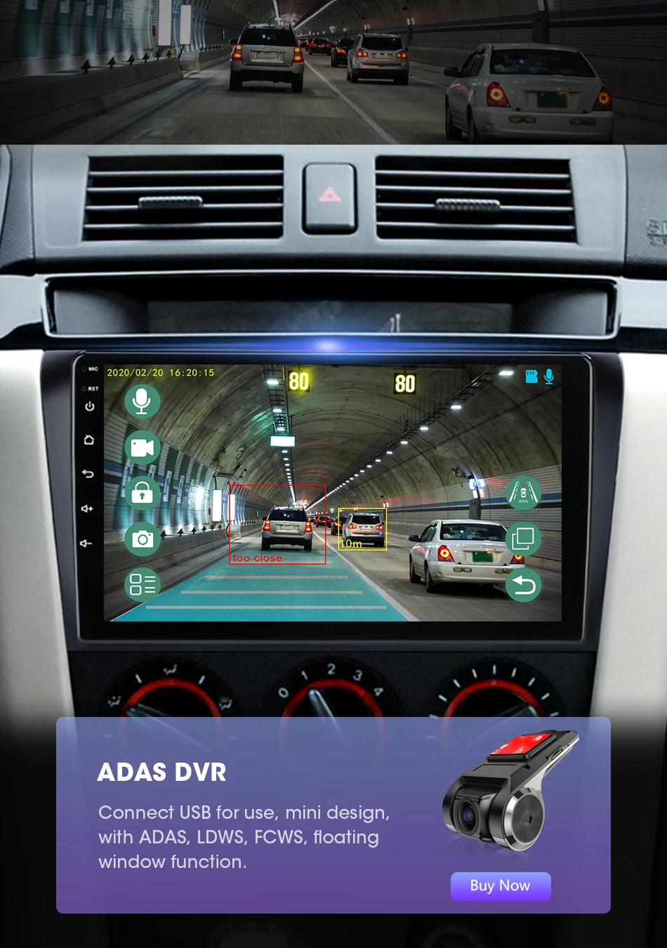 Поддерживает подключение к ADAS DVR. ADAS DVR имеет несколько встроенных технологий вспомогательного вождения,
