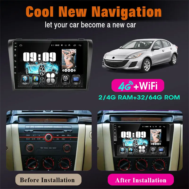 Автомагнитола 2DIN, мультимедийный видеоплеер для Mazda 3 10,0-2003, 4 + 64 ГБ, Android 2009, GPS-навигация, DSP, RDS, Разделенный экран с рамкой